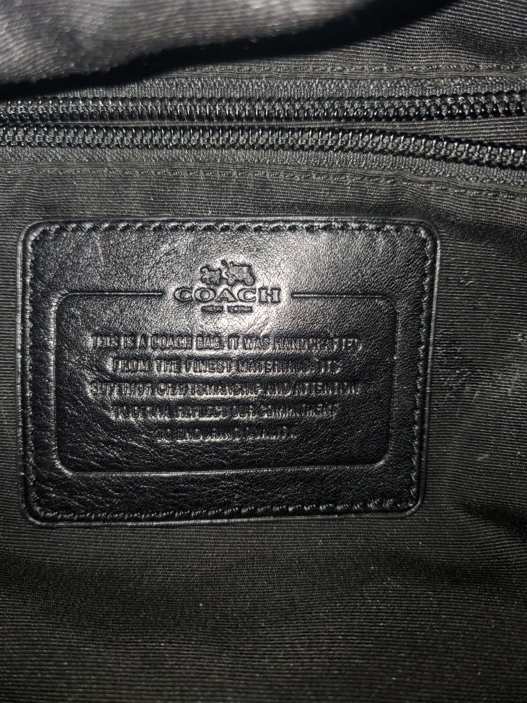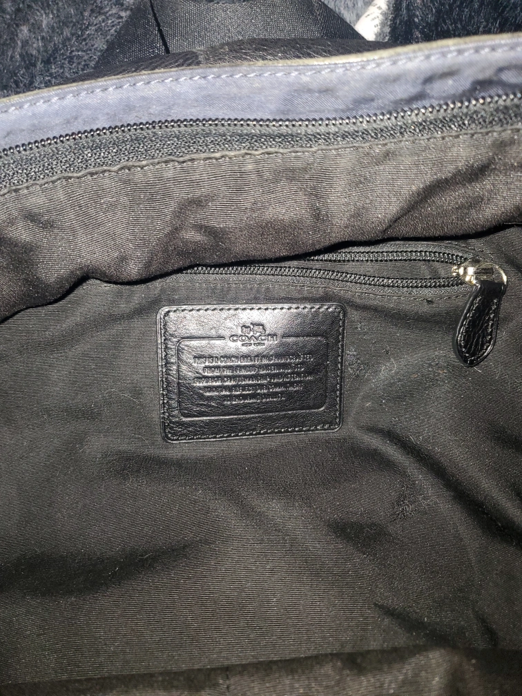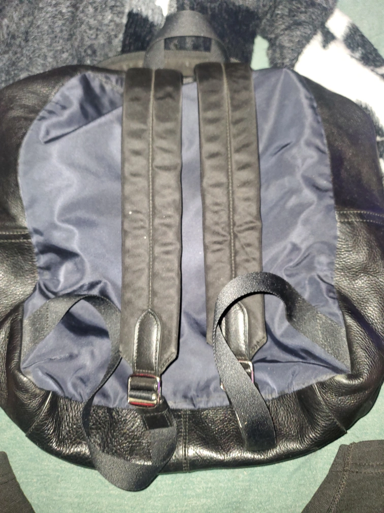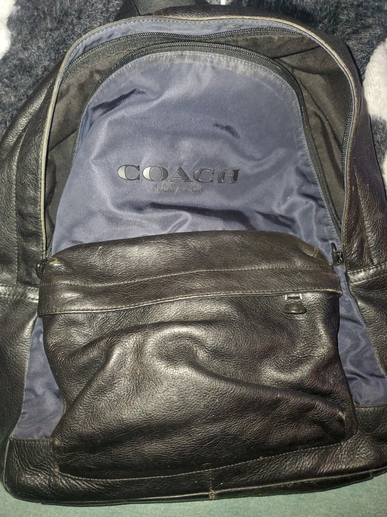 67Pre-owned Coach backpack. Black leather and navy blue nylon. Multiple compartments. Adjustable straps.