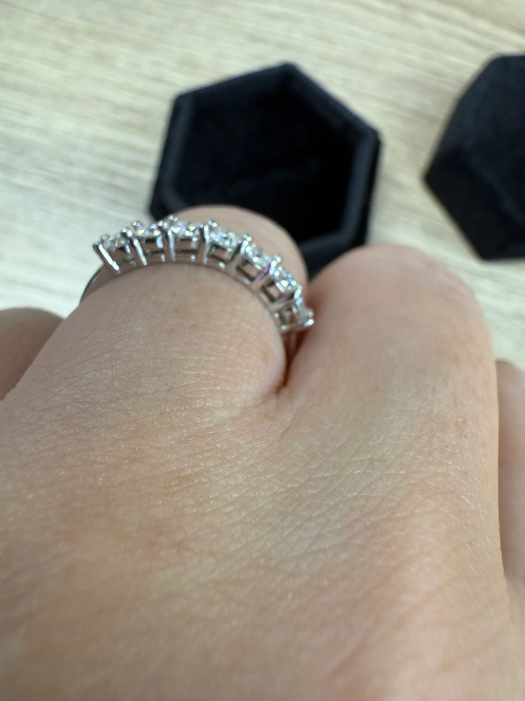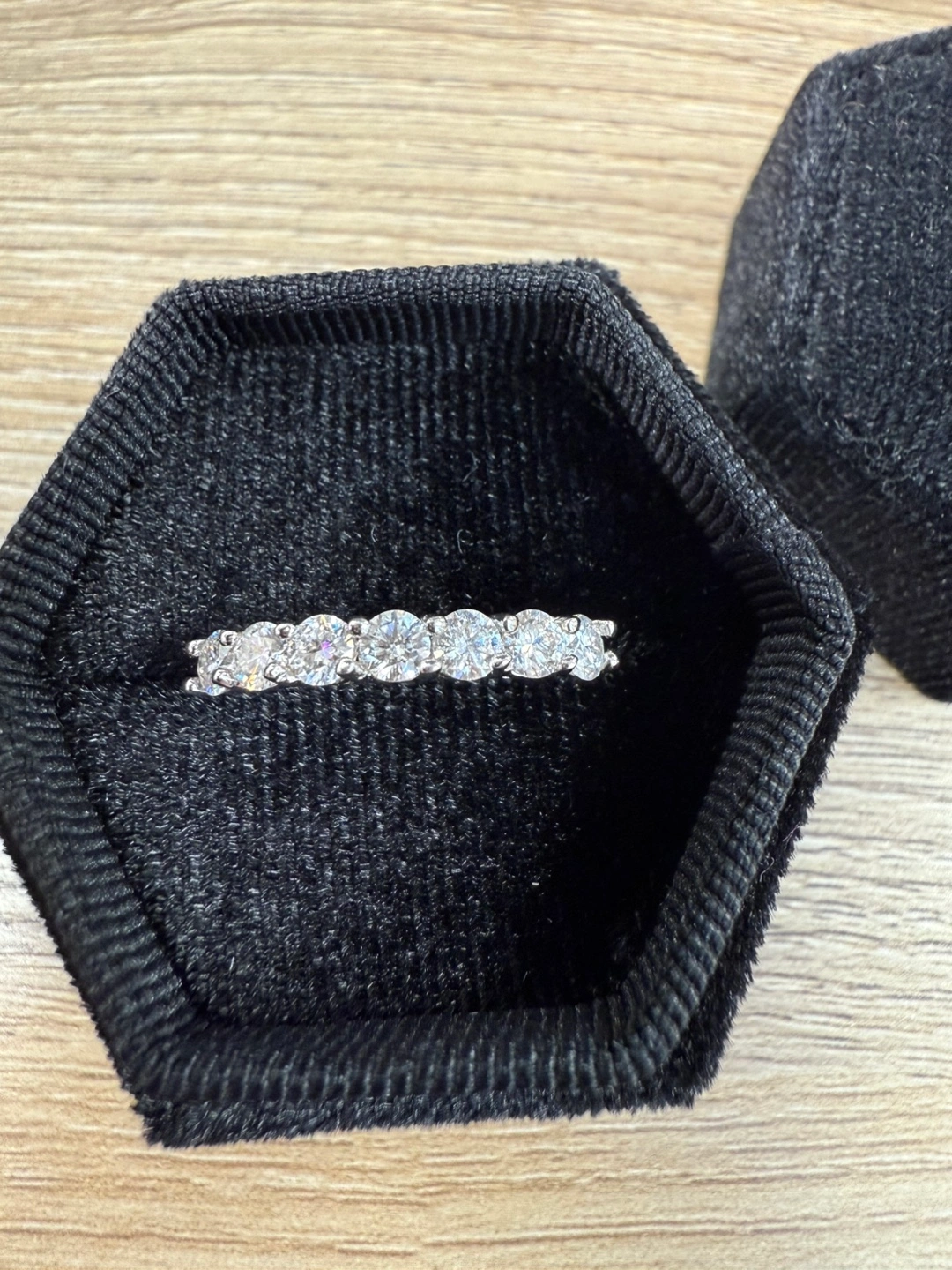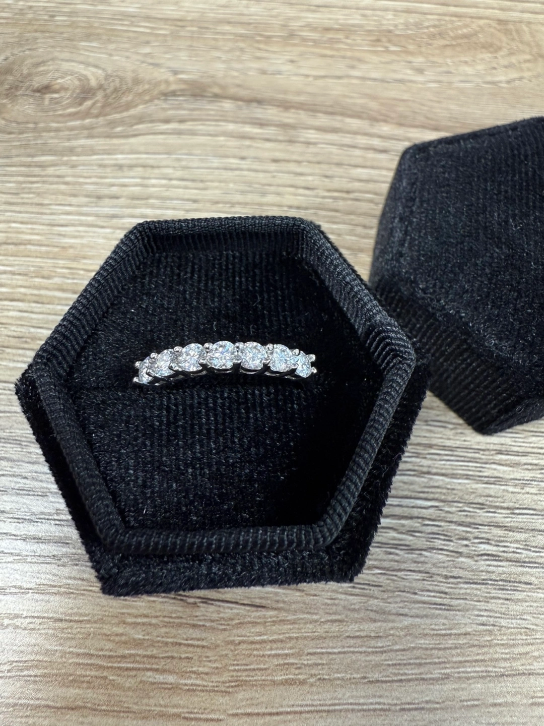 Stunning seven-stone diamond-like moissanite sterling silver band. Sparkling clear stones. Elegant design. Perfect for everyday wear or special occasions. Comes in a random box. Velvet box +$5