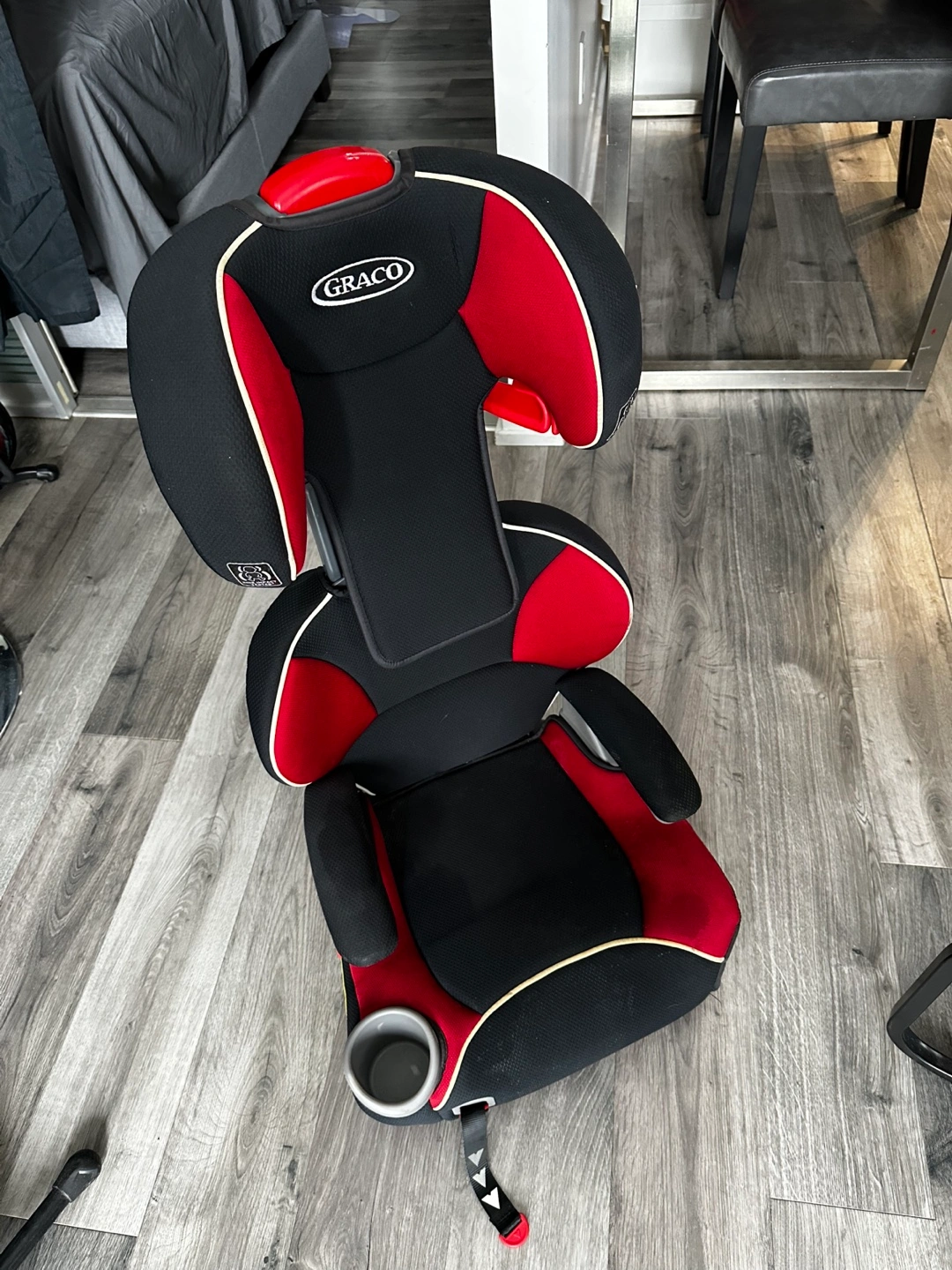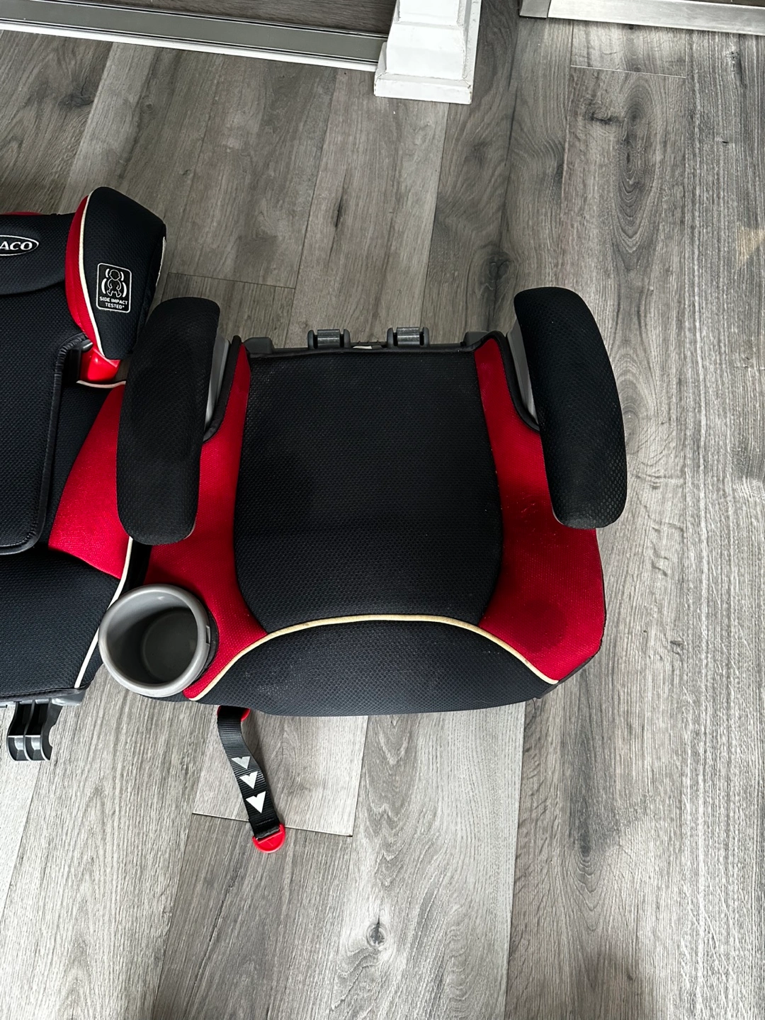 Red and black booster seat. Detachable back. Cup holder. Rarely used. Only for travel.