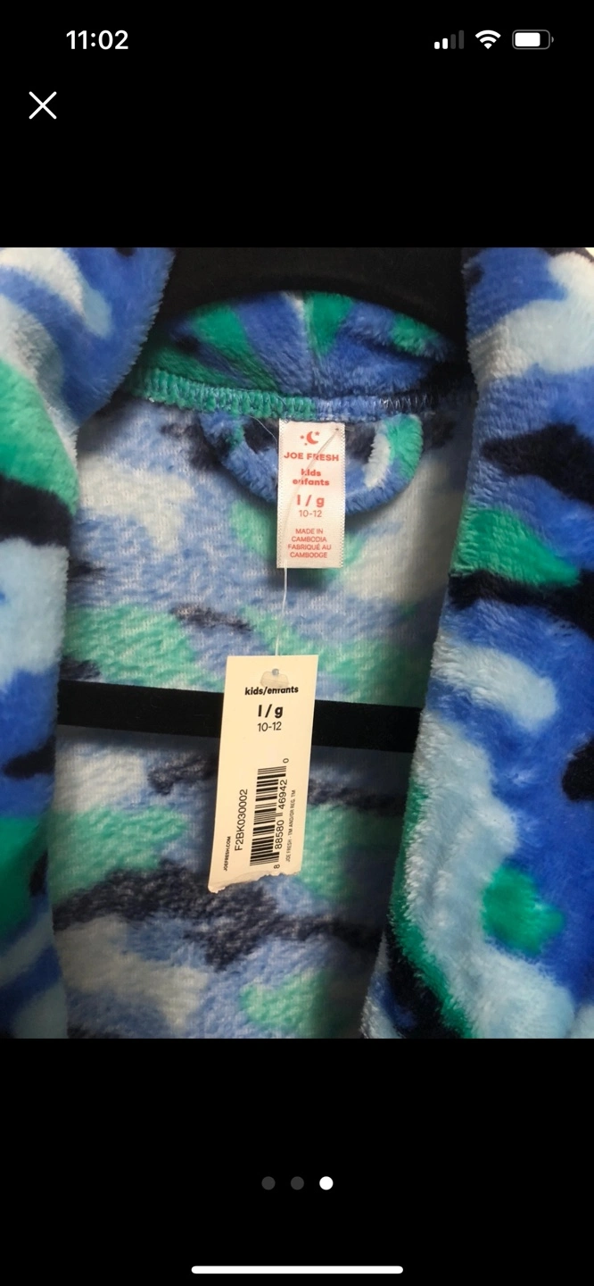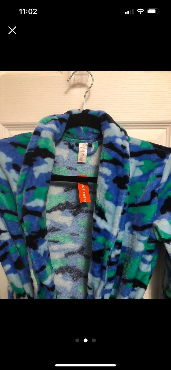 Brand new Kids' fleece robe. Blue camo print. Size 10-12. Long sleeves, attached belt. Soft and cozy.