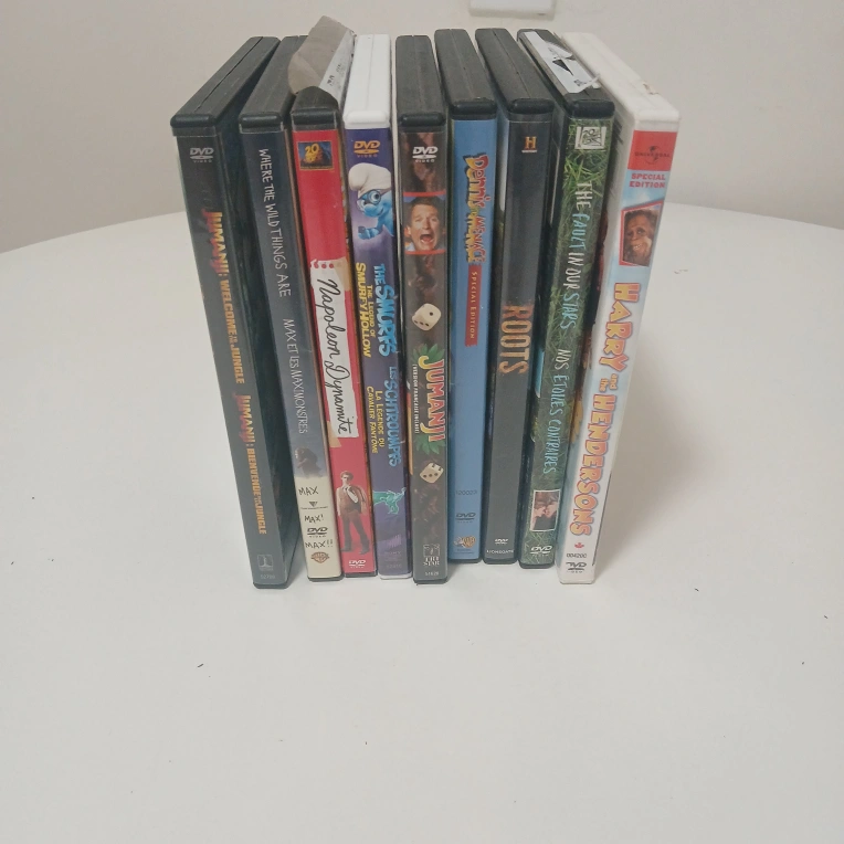 Collection of 10 DVDs. Titles include Jumanji, Napoleon Dynamite, The Smurfs, Harry and the Hendersons, and more. Various genres and ratings.