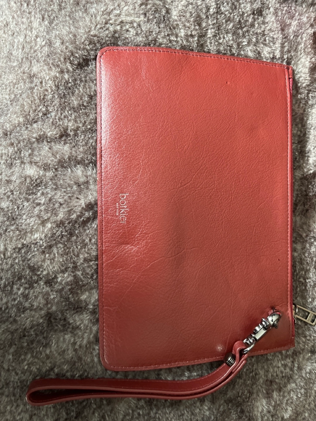 Burgundy leather clutch. Zip closure. Interior grey lining. Detachable wrist strap. Subtle quilted detailing.