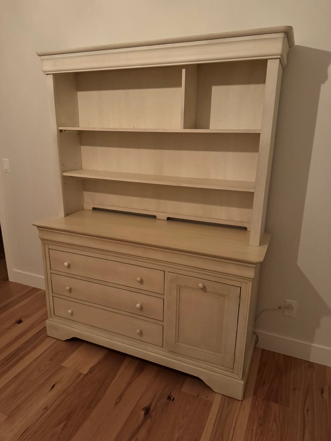 Off-white painted wood furniture set. Includes convertible crib, sleigh bed, three-drawer dresser with mirror, and hutch. Excellent condition, minor wear. The price is for everything. Original price $5 K