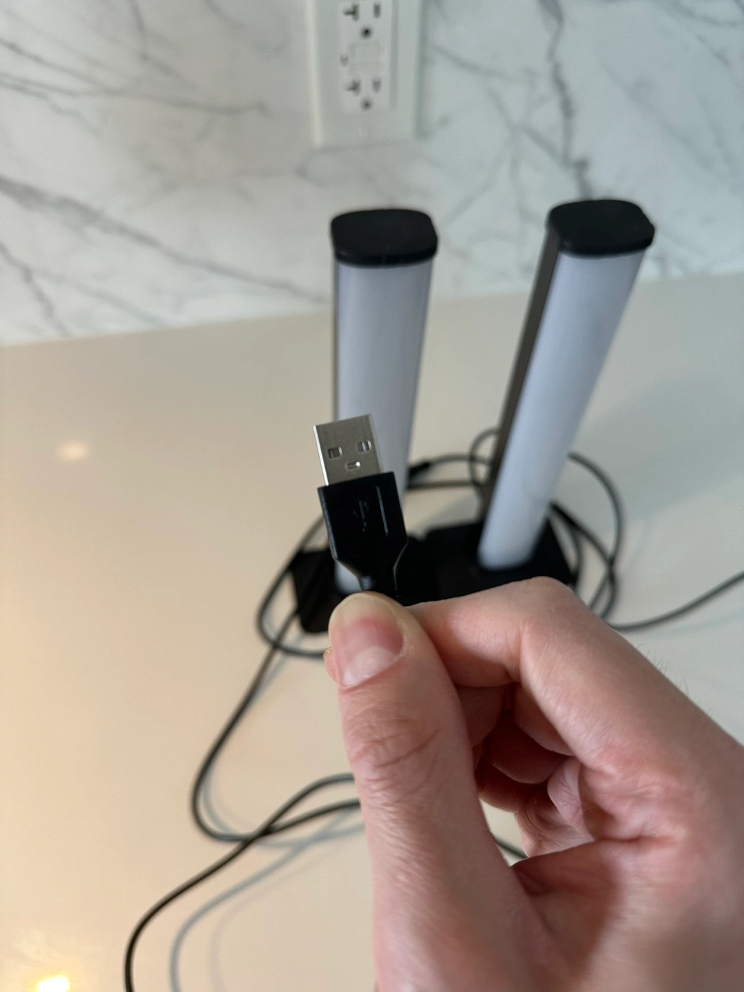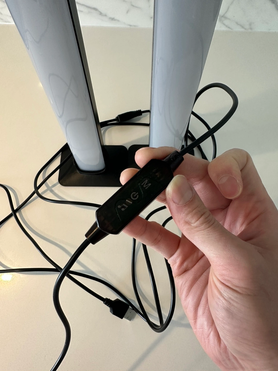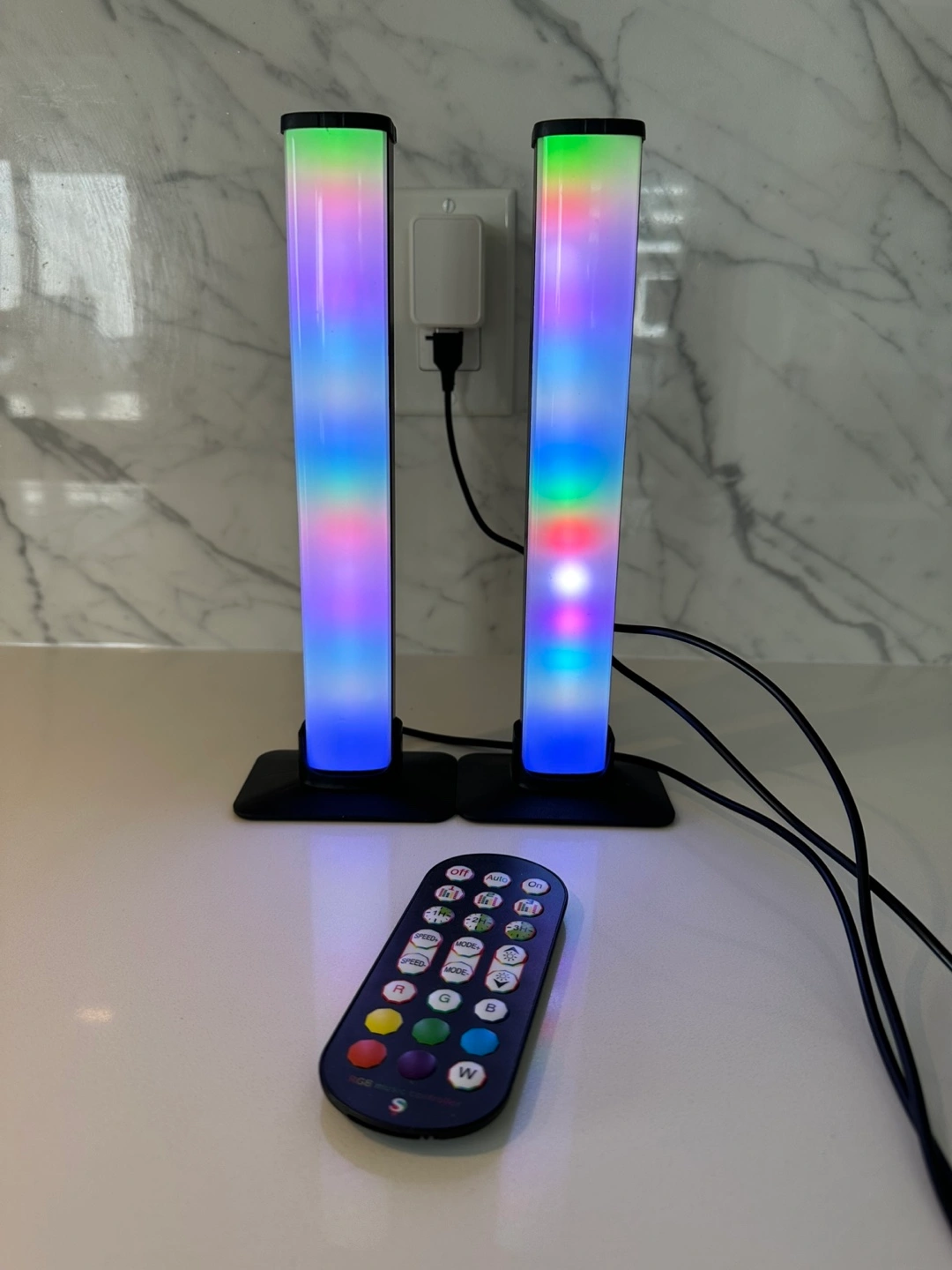 Two sleek LED lights, USB powered. Includes a remote control for colour and brightness adjustment. Great for ambiance or accent lighting. The length of the cord is around 8ft.