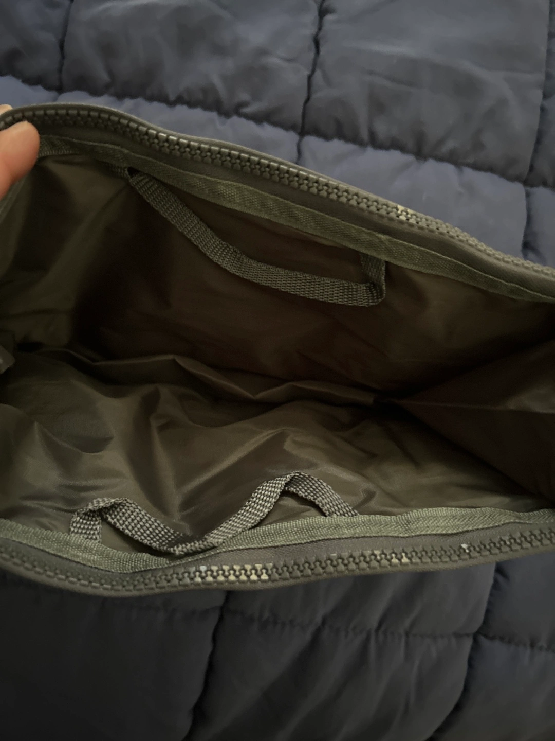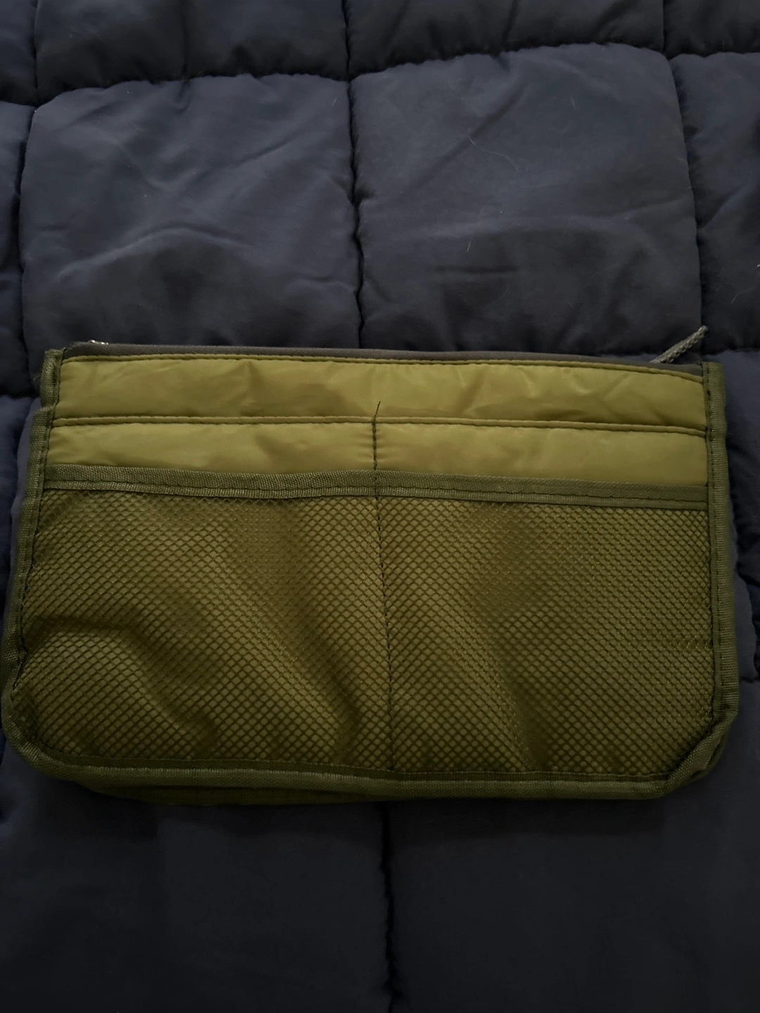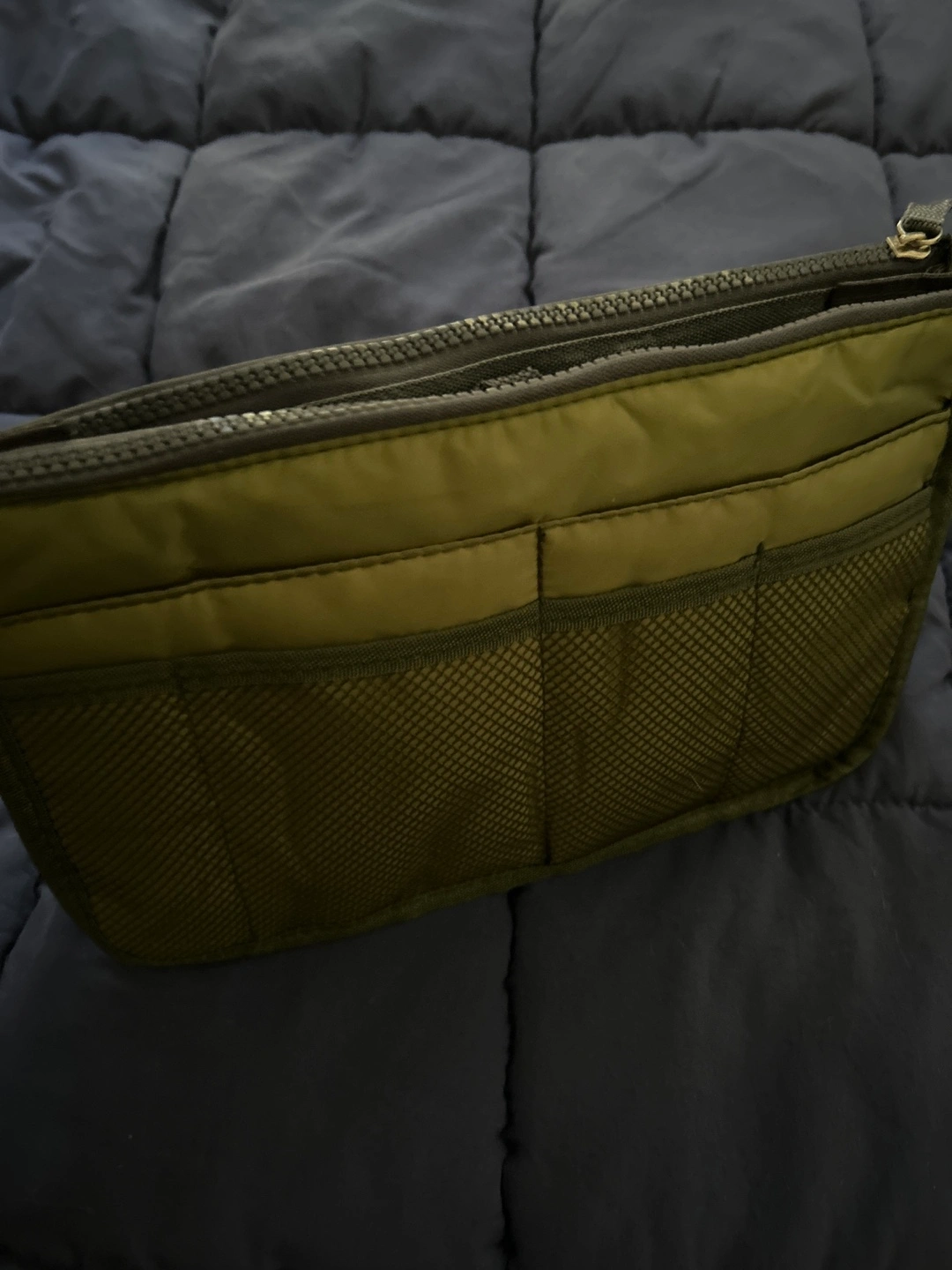 647Multi-compartment organizer. Olive green nylon exterior. Multiple pockets and zipper closure. Great for travel or everyday use.