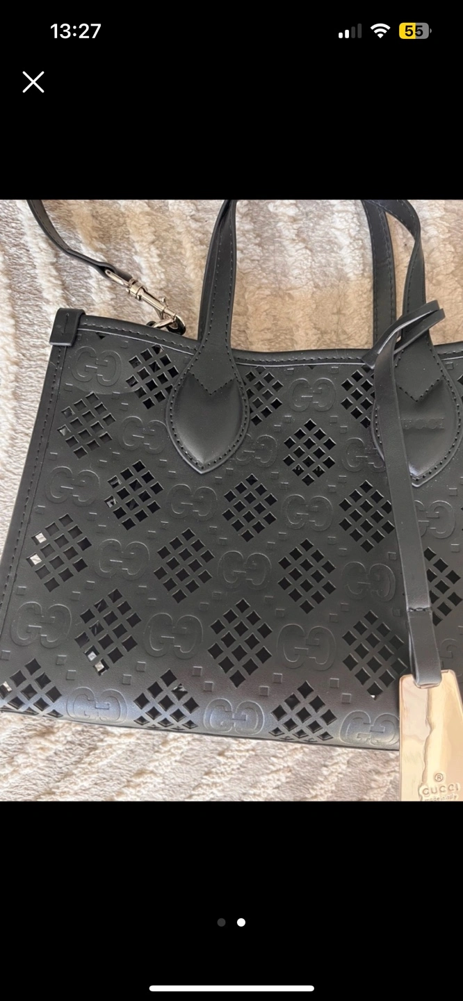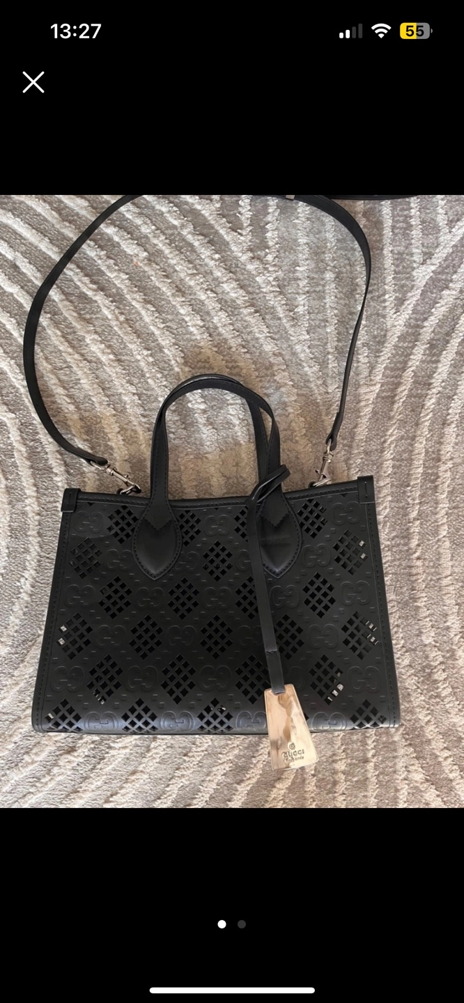 632Black leather tote bag. Includes a shoulder strap and a small tag. Stylish and elegant.