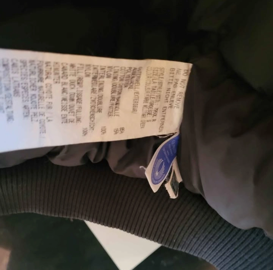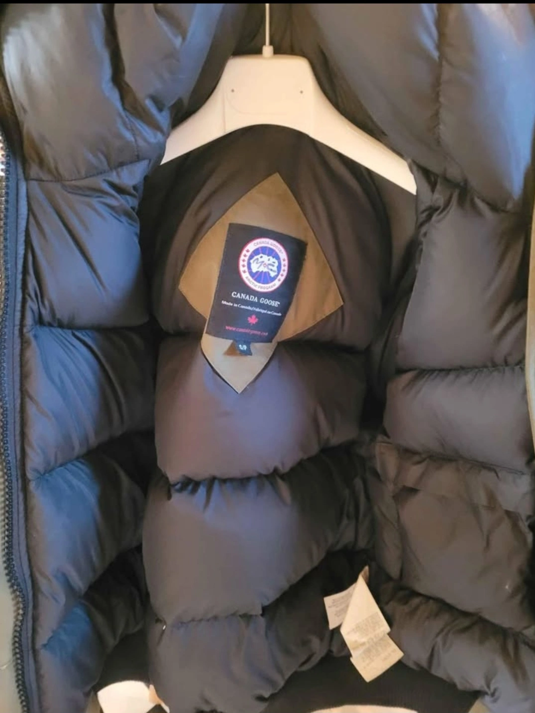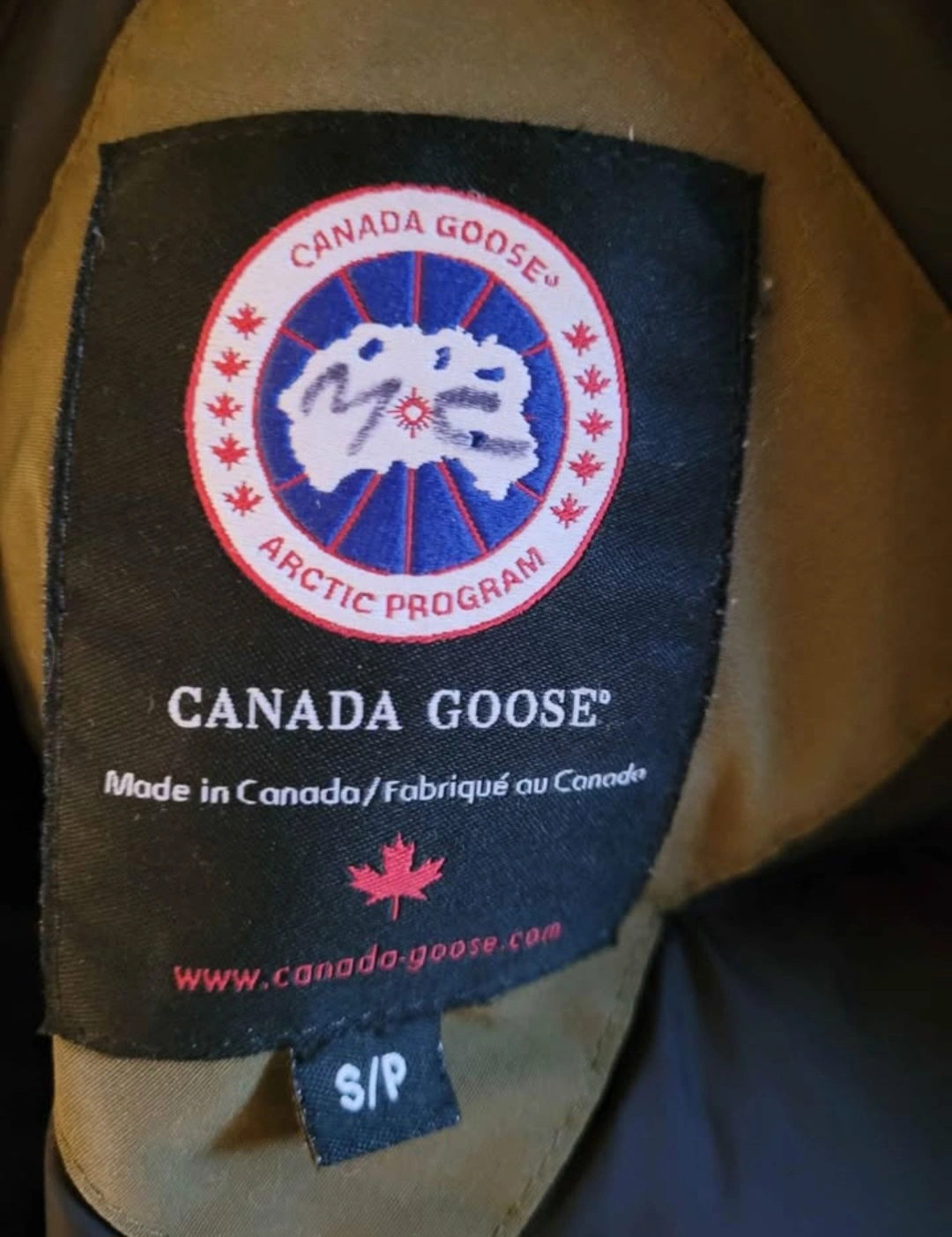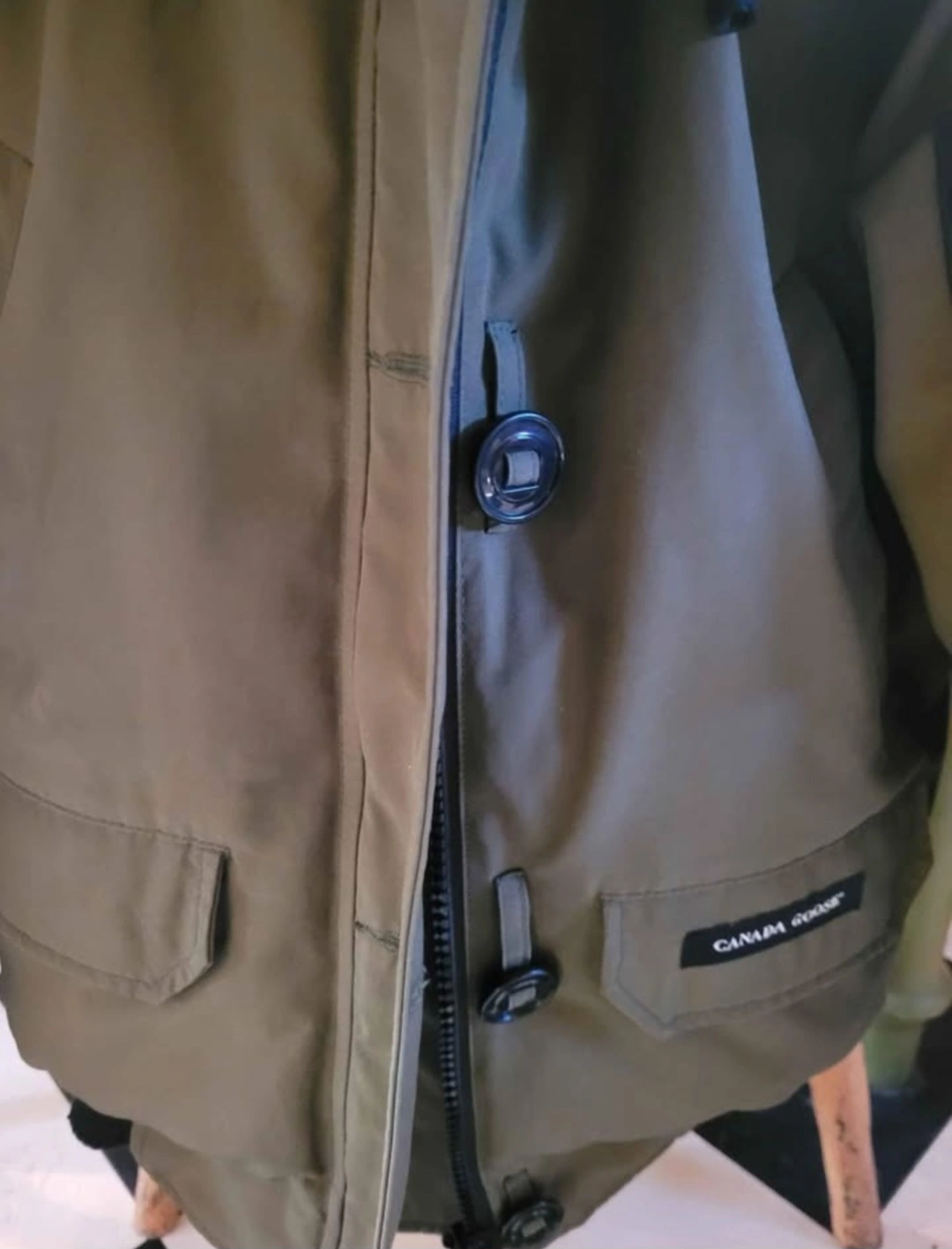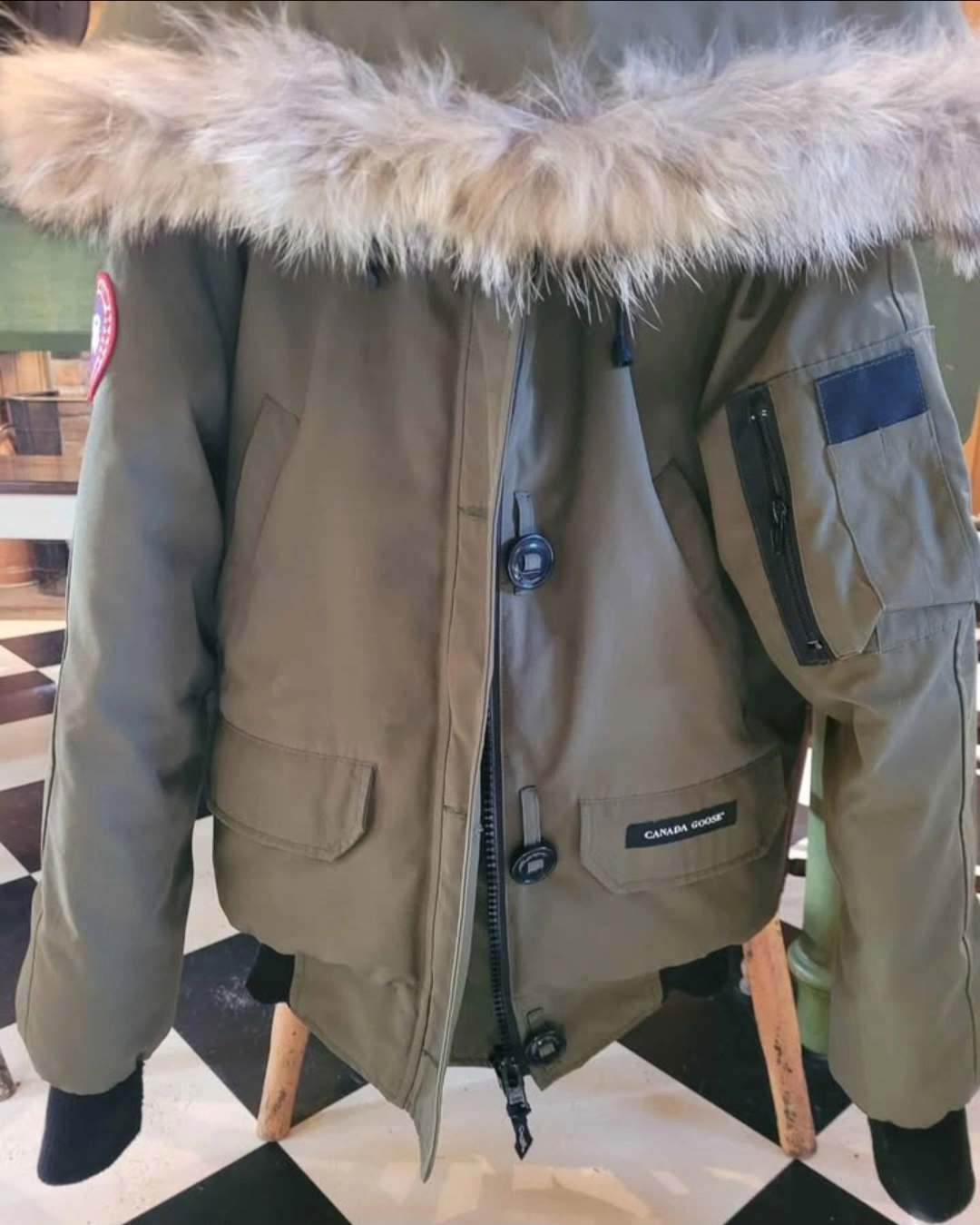 Olive green bomber. Down-filled. Fur-trimmed hood. Multiple pockets. Size small. Made in Canada.
