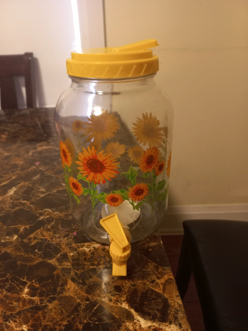 84Glass beverage dispenser. Features a sunflower design and yellow plastic lid and spout. Perfect for serving drinks. 4L capacity
