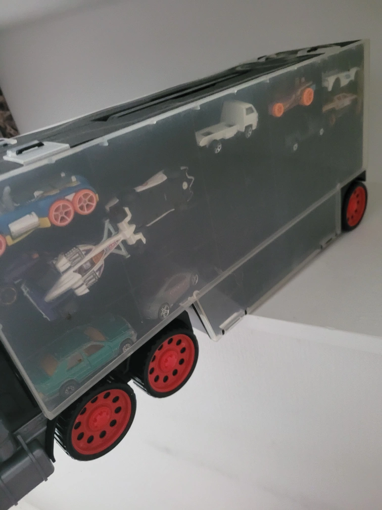 Large Hot Wheels carrier truck. Holds many cars. Red and black. Clear plastic casing. Great for collectors or kids.