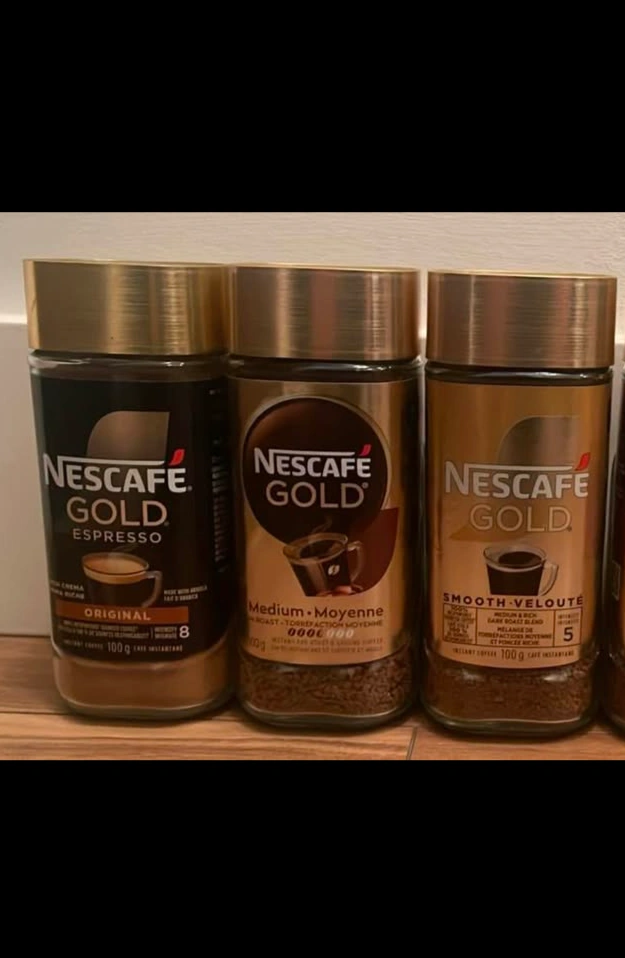 100g jars of Nescafé Gold instant coffee. Flavours include Espresso Original, Medium, and Smooth Velouté.
