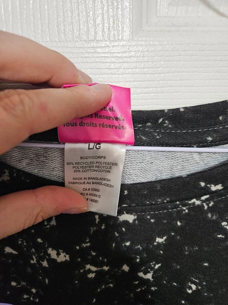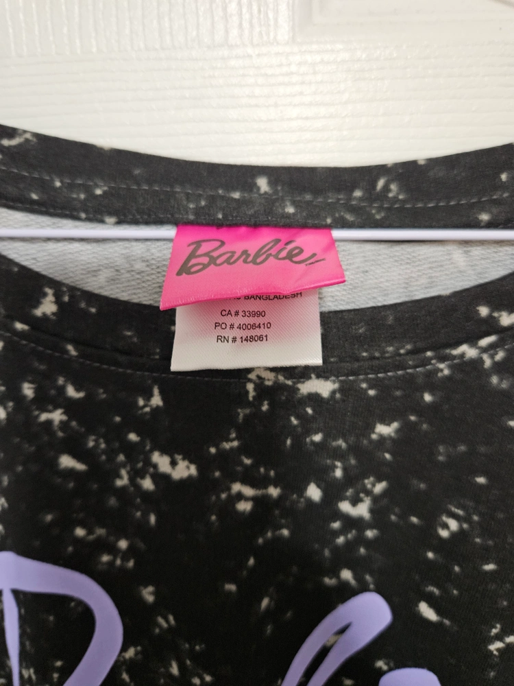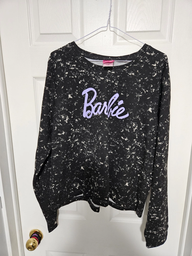 83Women's size large Barbie sweatshirt. Black and white spattered print. Long sleeves. Cropped length. Soft material. Never worn