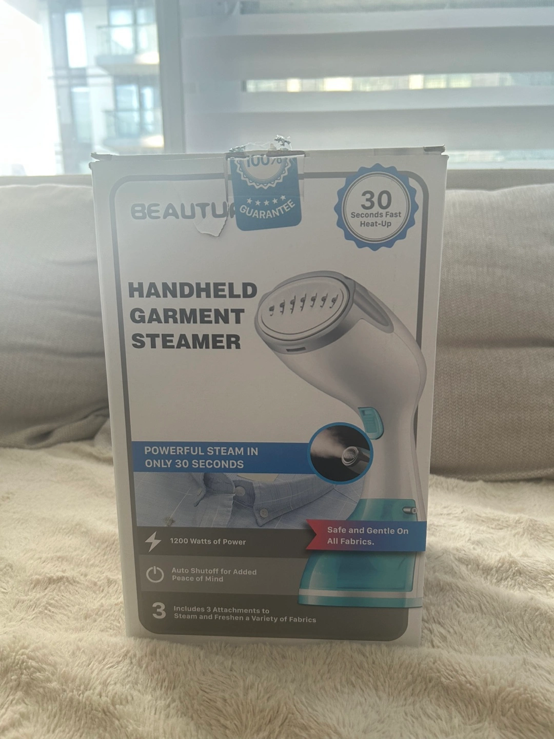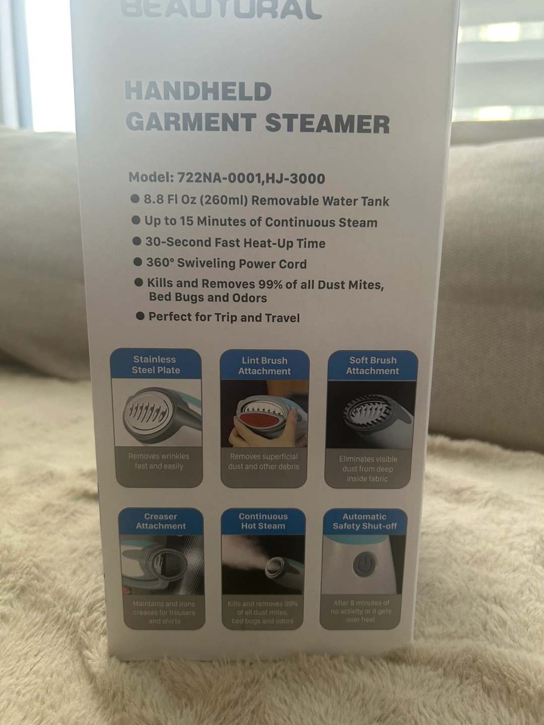 Powerful handheld garment steamer. Heats up in 30 seconds. Features auto shutoff for safety. Includes three attachments: lint brush, soft brush, and creaser.