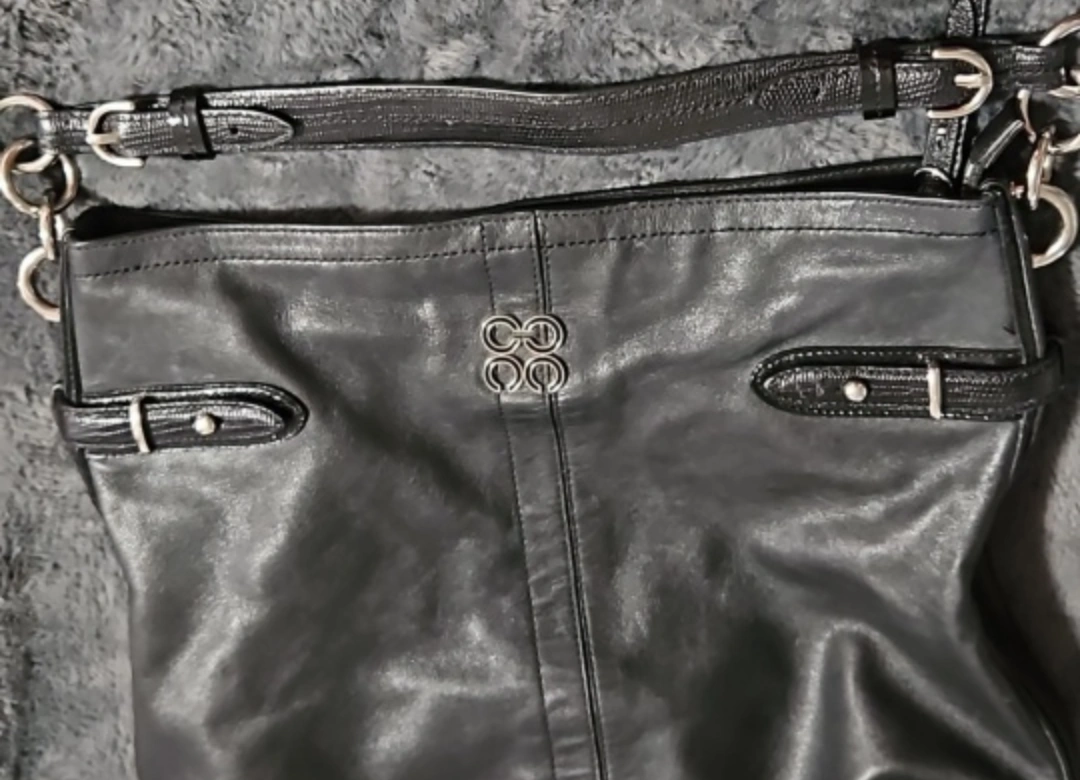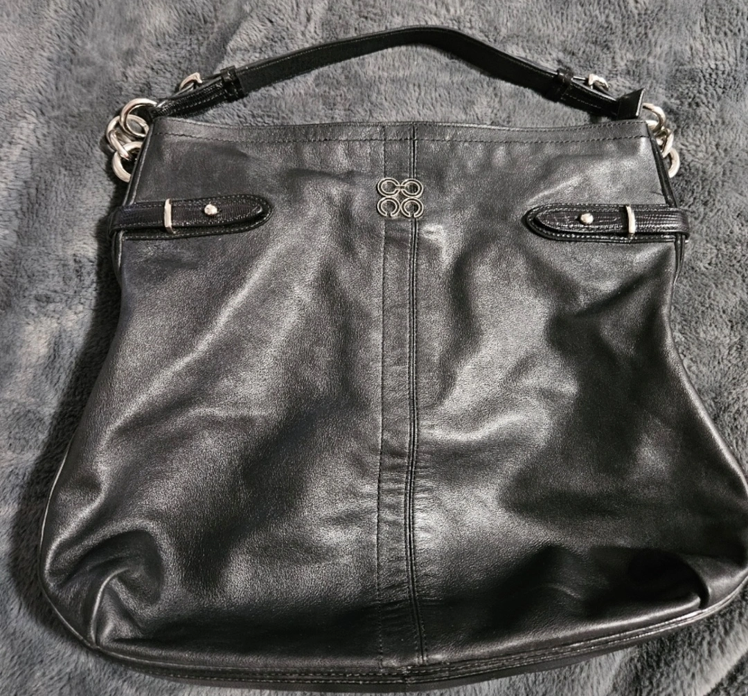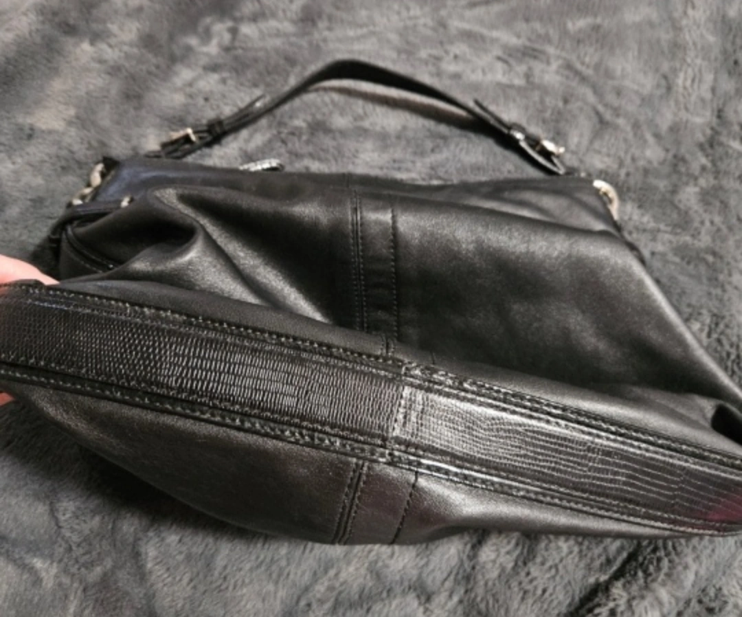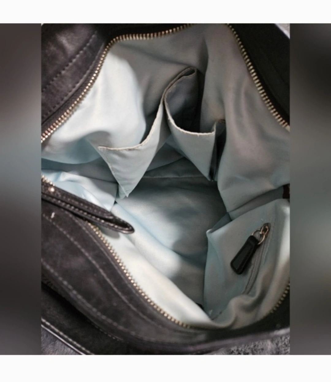 83Gorgeous black leather hobo bag. Features silver-toned hardware. Interior has light blue lining and pockets. Zipper closure. Shoulder strap included.