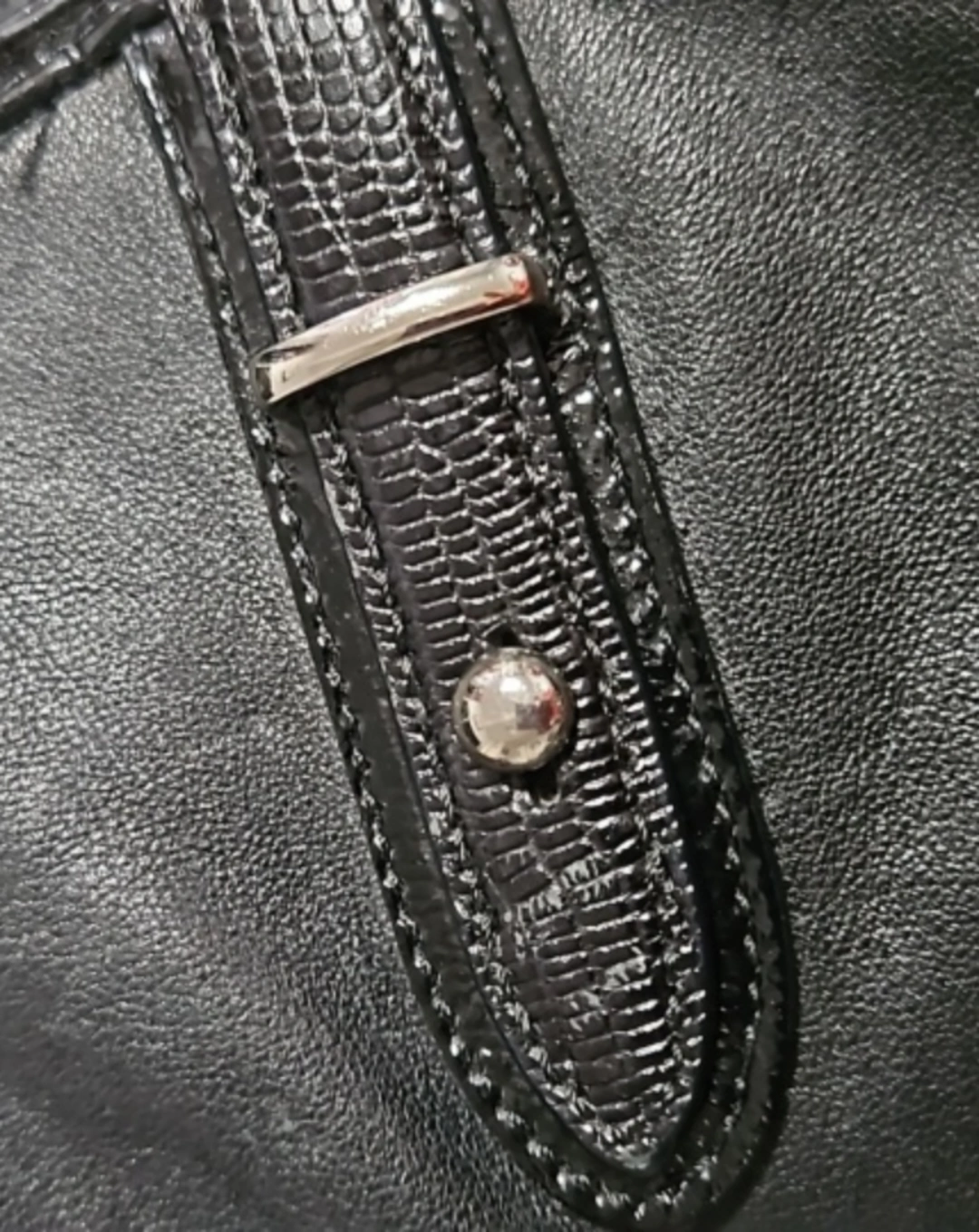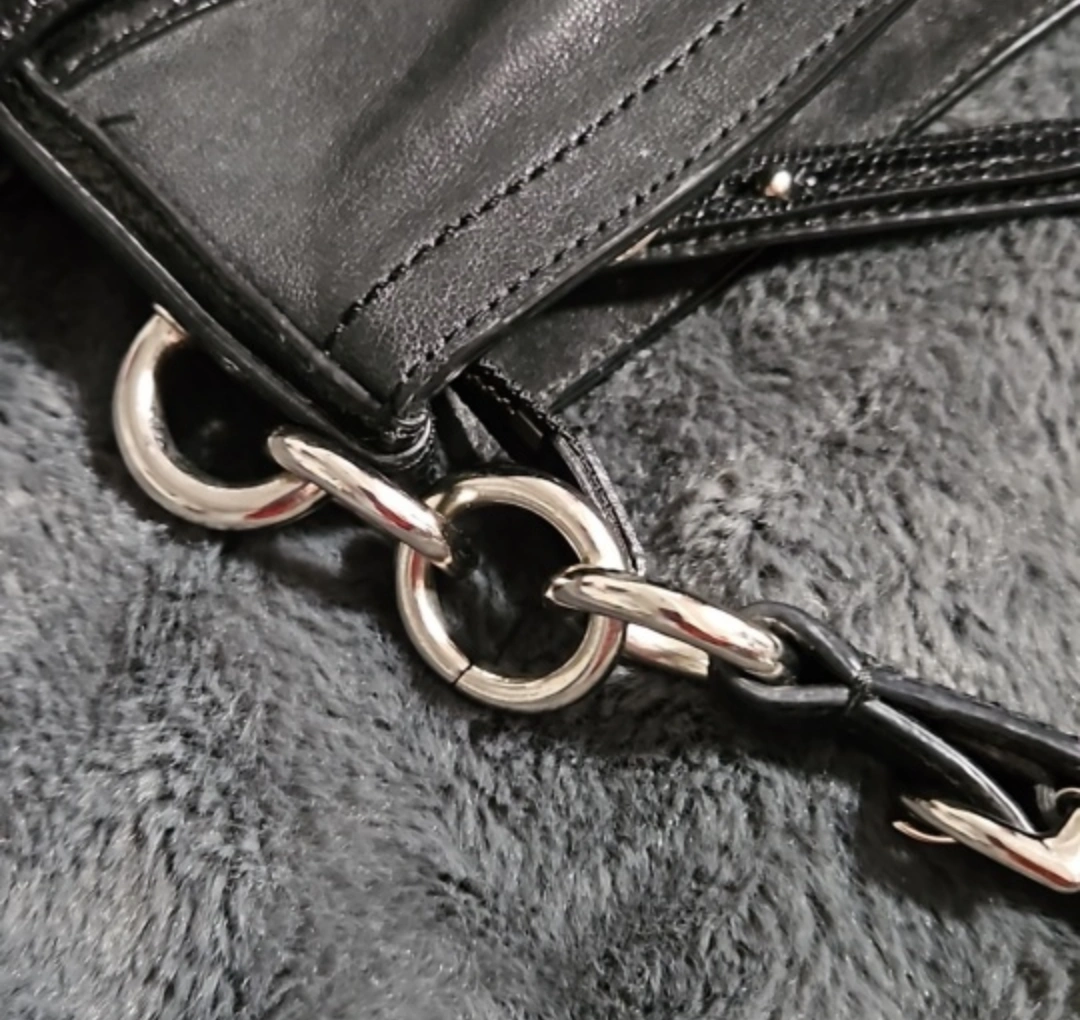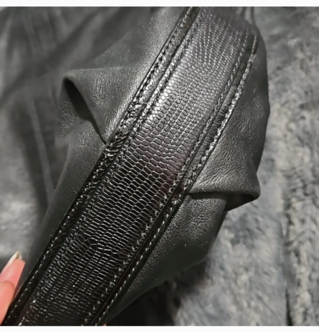 83Gorgeous black leather hobo bag. Features silver-toned hardware. Interior has light blue lining and pockets. Zipper closure. Shoulder strap included.