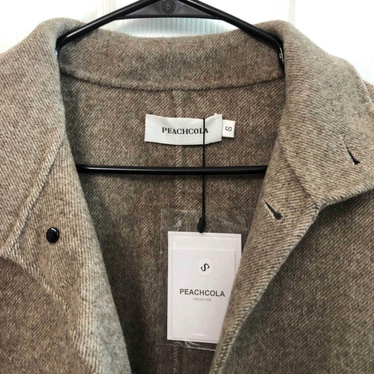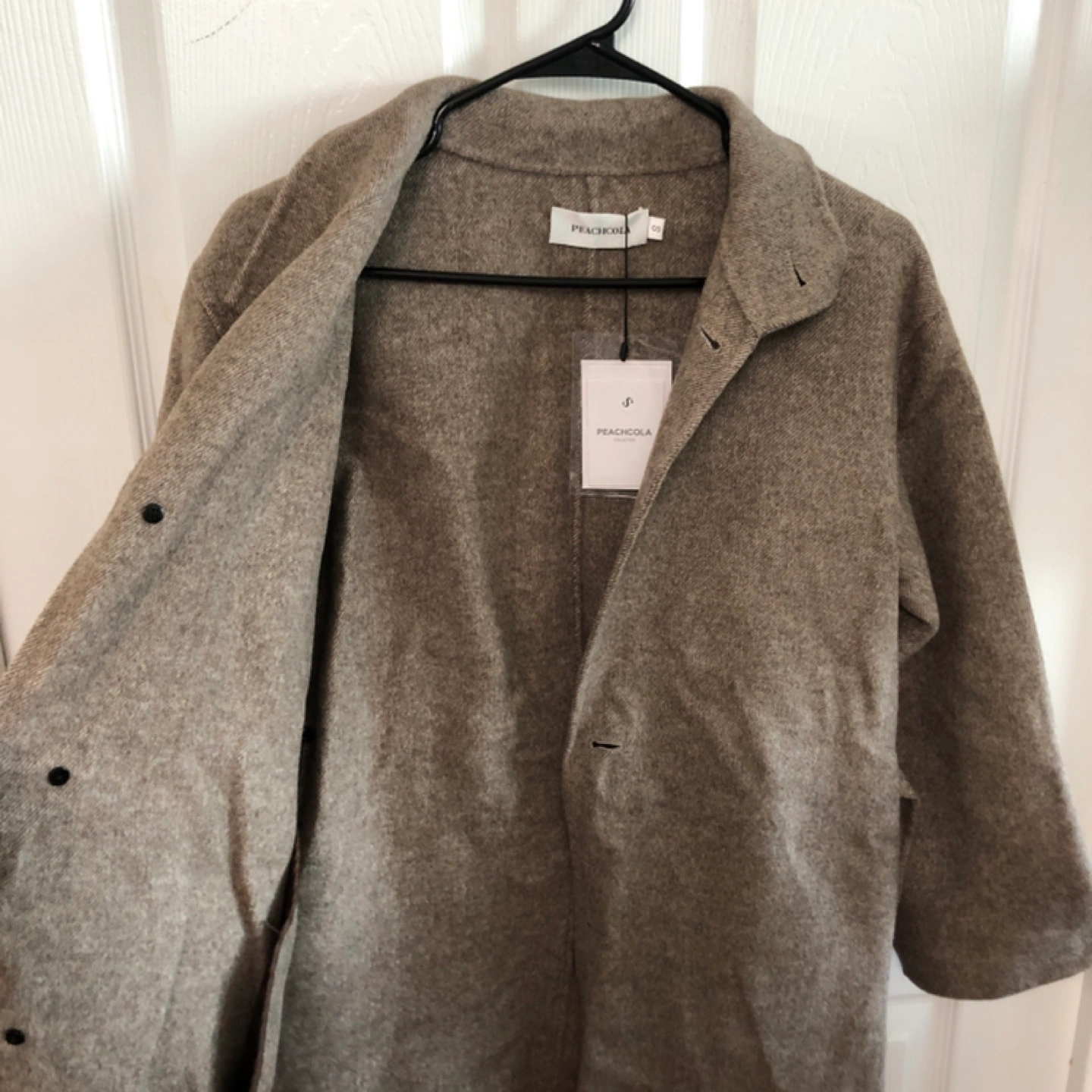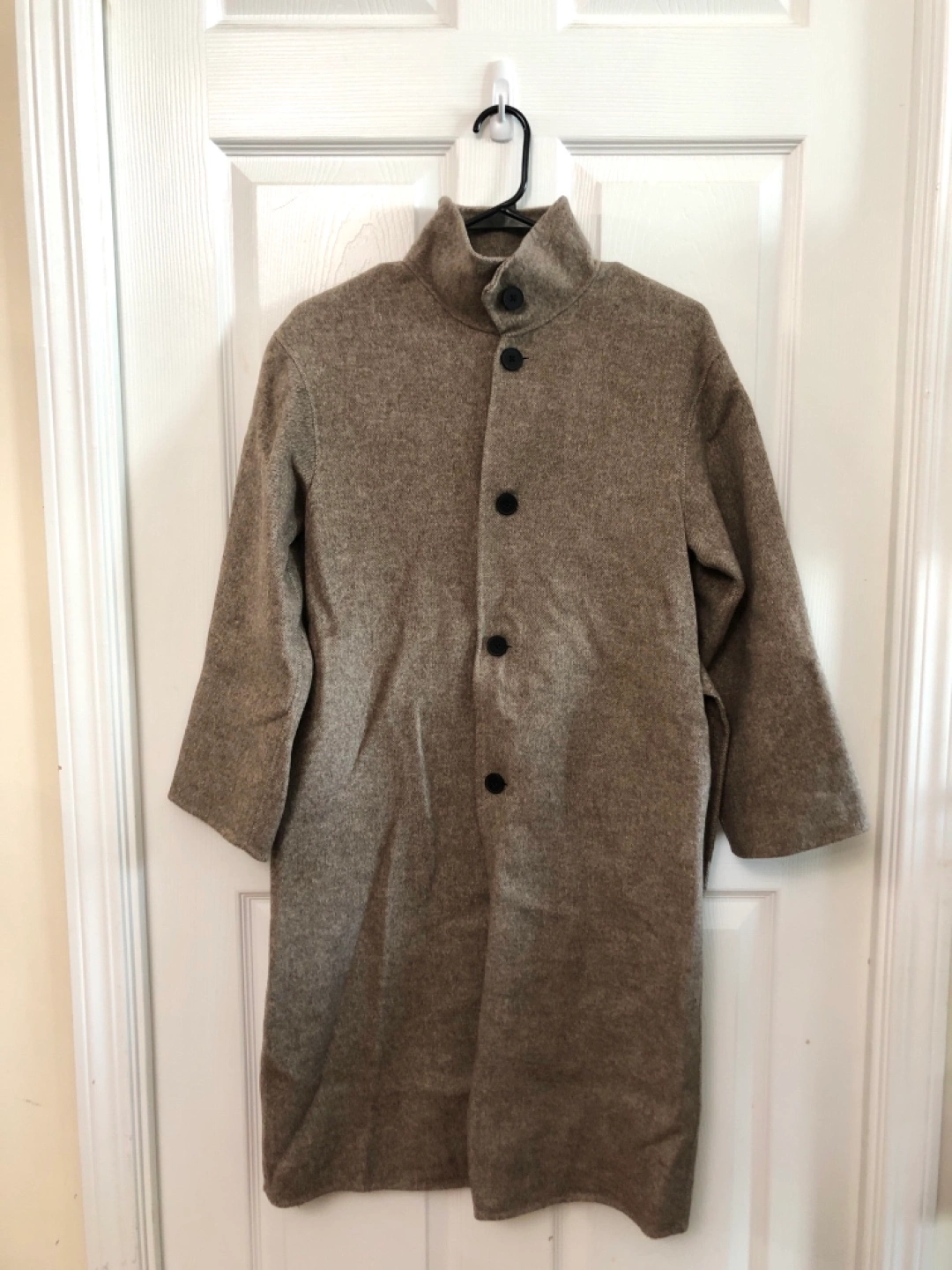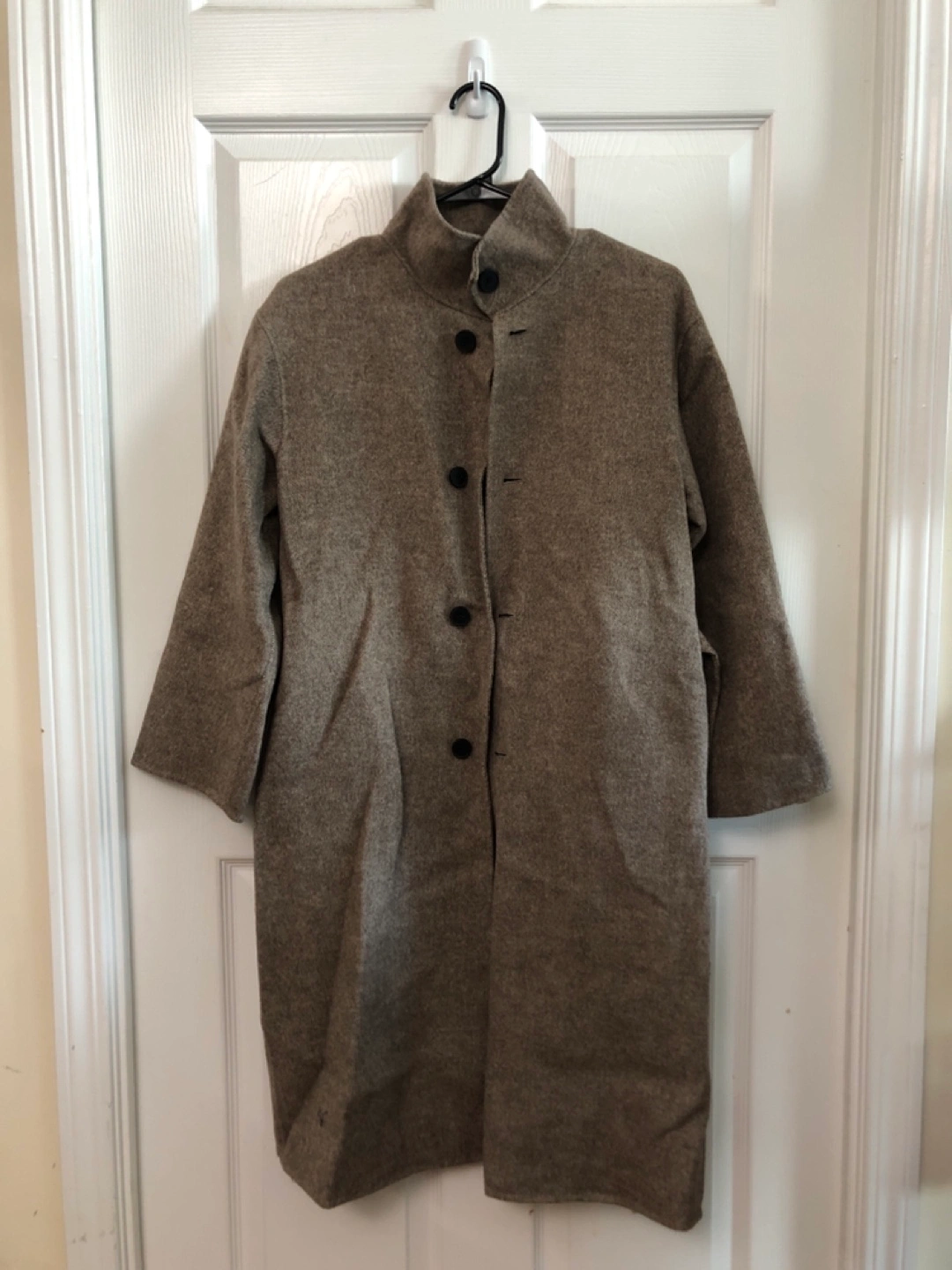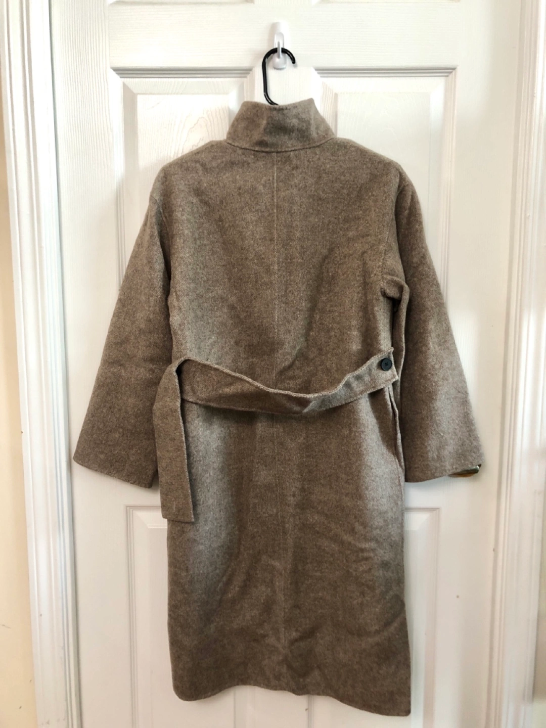 Taupe coloured wool blend coat. Features a relaxed fit, and a self-tie belt. Simple button closure. Excellent condition.