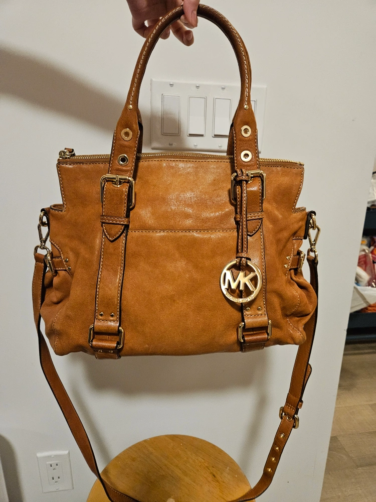 Gorgeous light brown leather satchel. Double top handles and a long adjustable shoulder strap. Gold-toned hardware. Zip closure. Multiple compartments. it's in a like new condition, Only used few times. Asking $80 or best offer. Pick up in Markham area. All sales are final. Thanks for checking my post.! Have a great day ๐