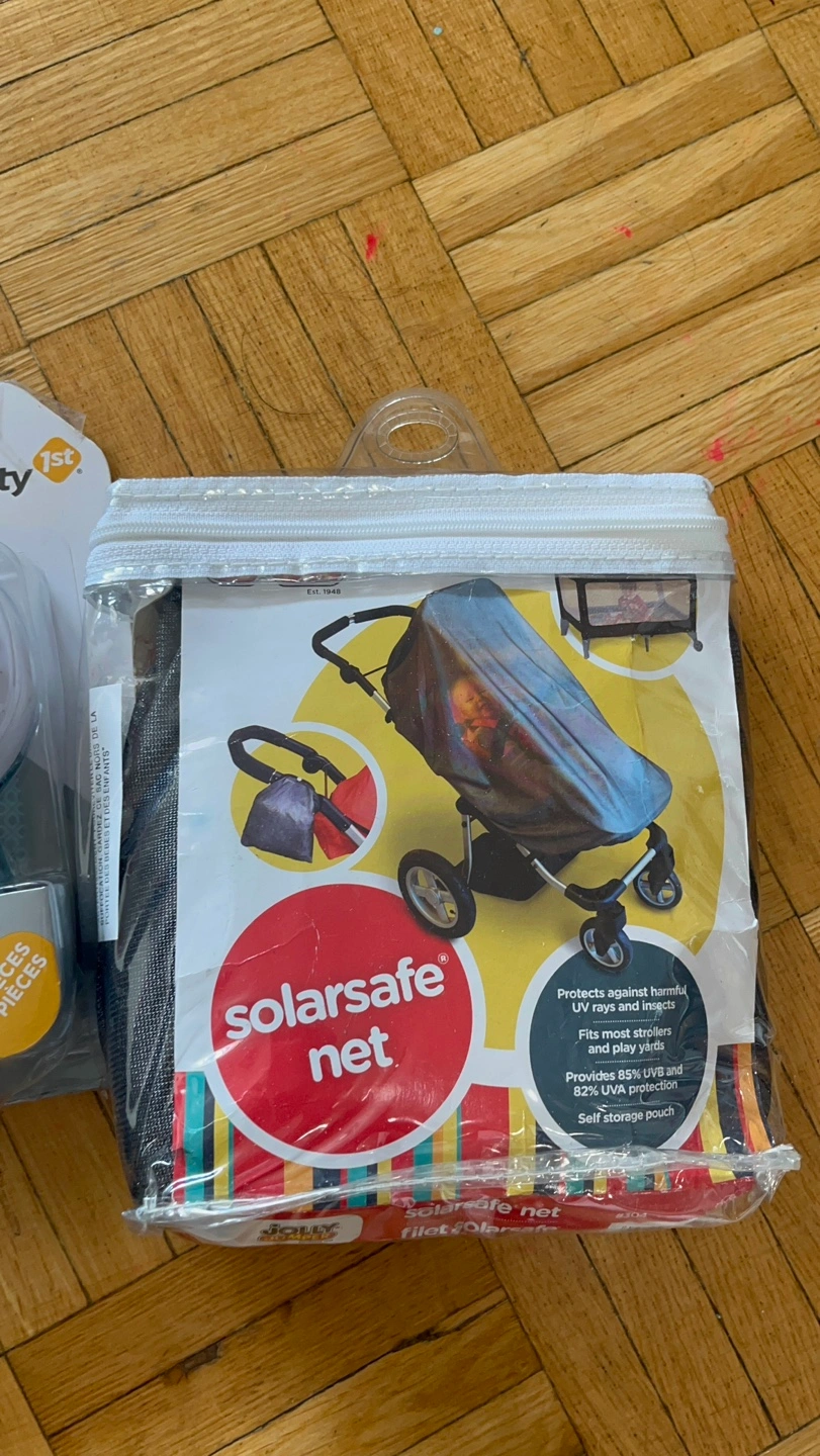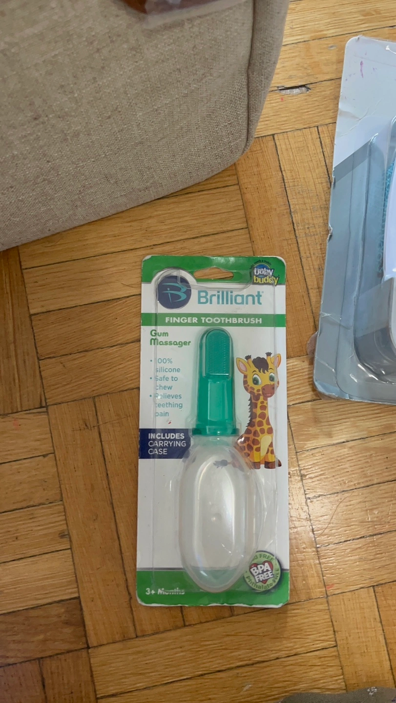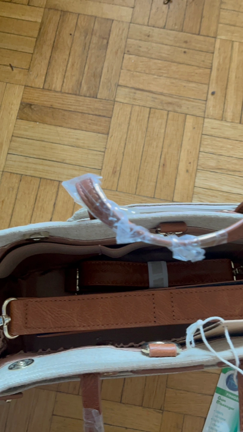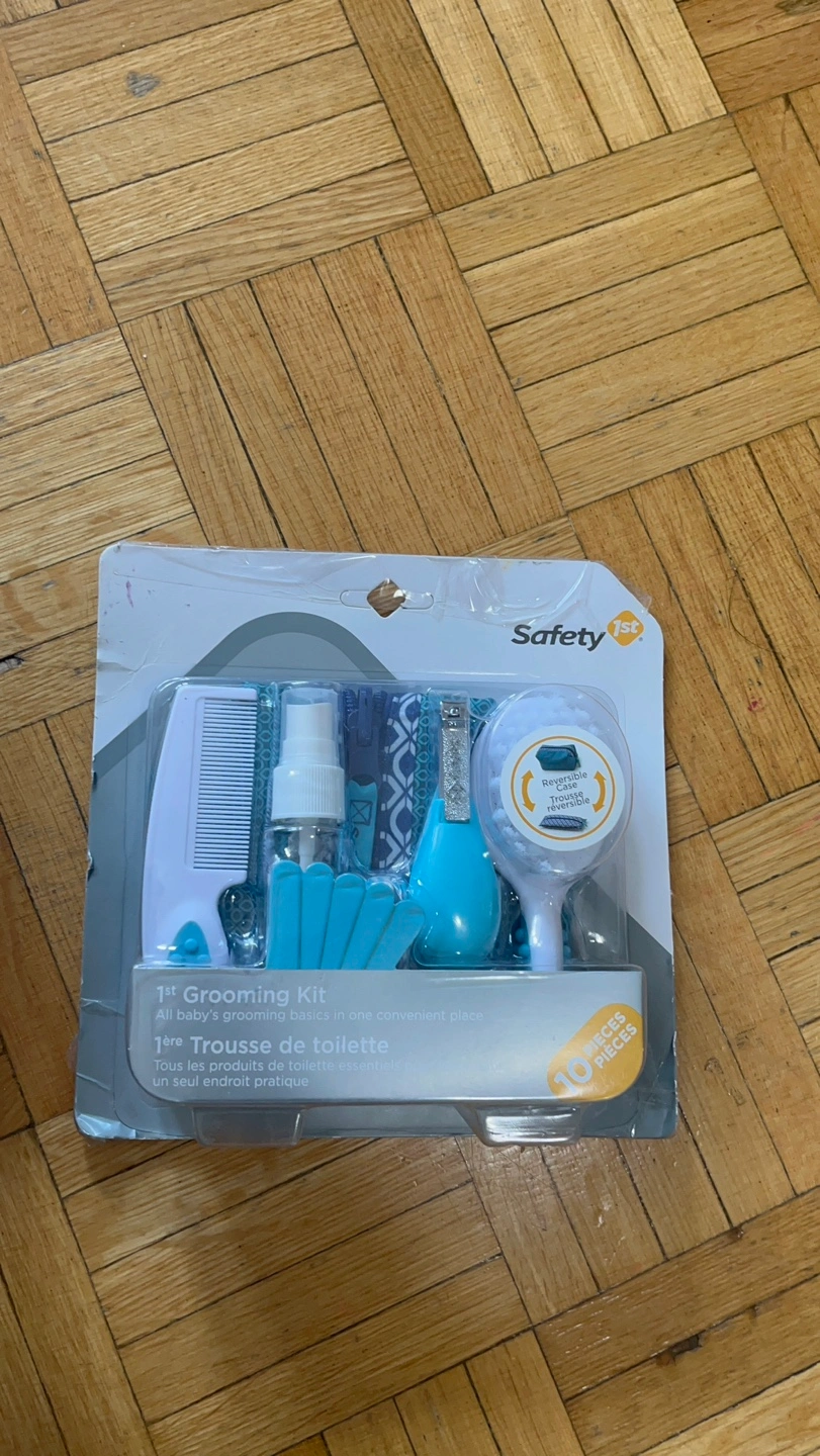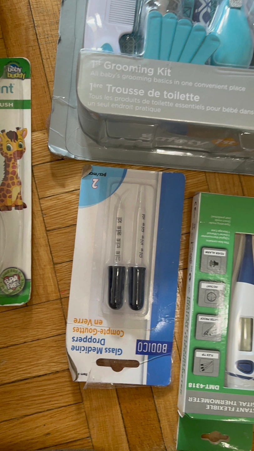 141New SOYOUNG beige tote bag with brown leather accents. Includes baby grooming kit, two glass medicine droppers, Brilliant Baby Buddy finger toothbrush, and digital thermometer. Great for baby's essentials.All brand new baby items