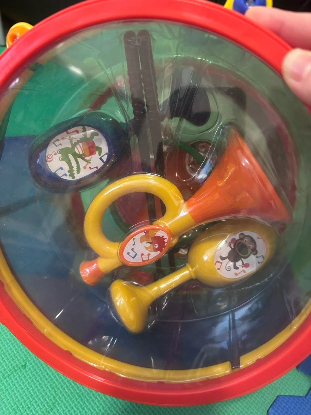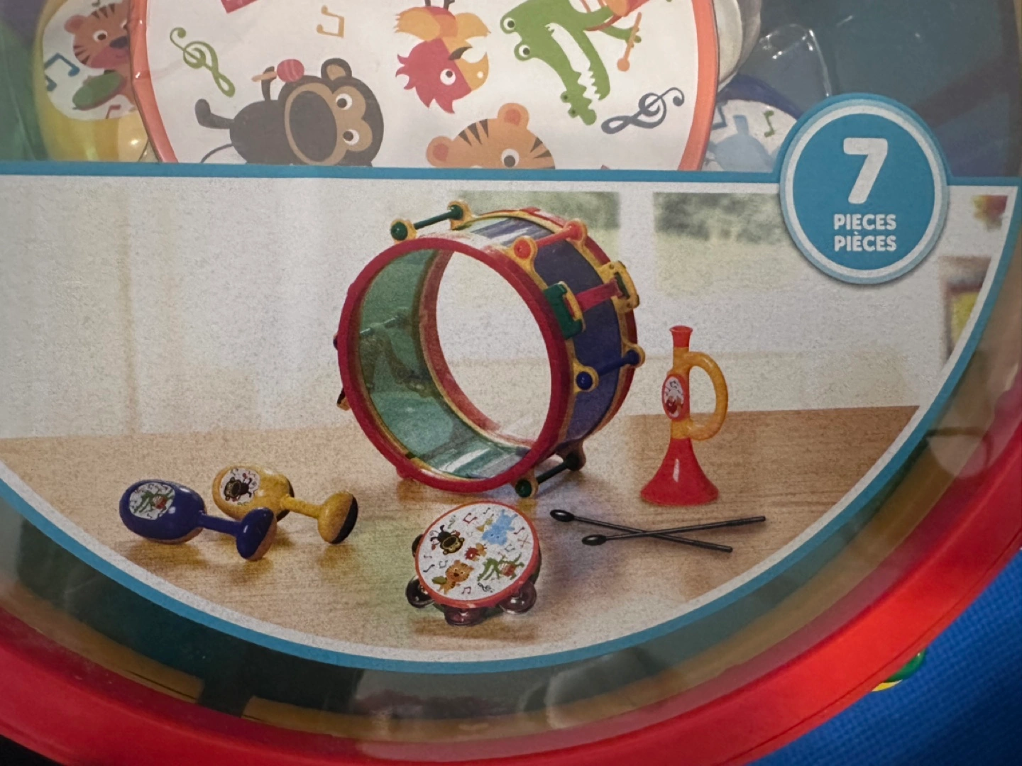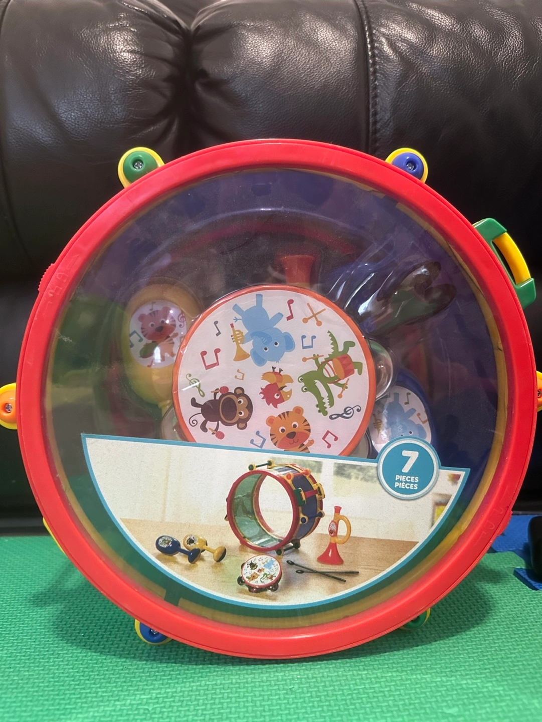 Adorable children's toy drum set. Includes a drum, tambourine, maracas, and horn. Perfect for imaginative play. Seven pieces total. Colorful and fun.