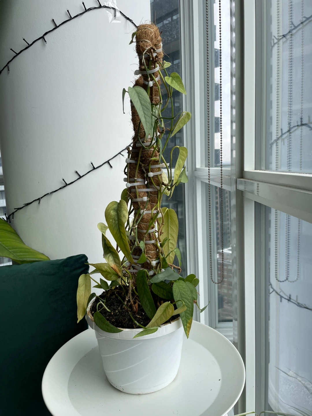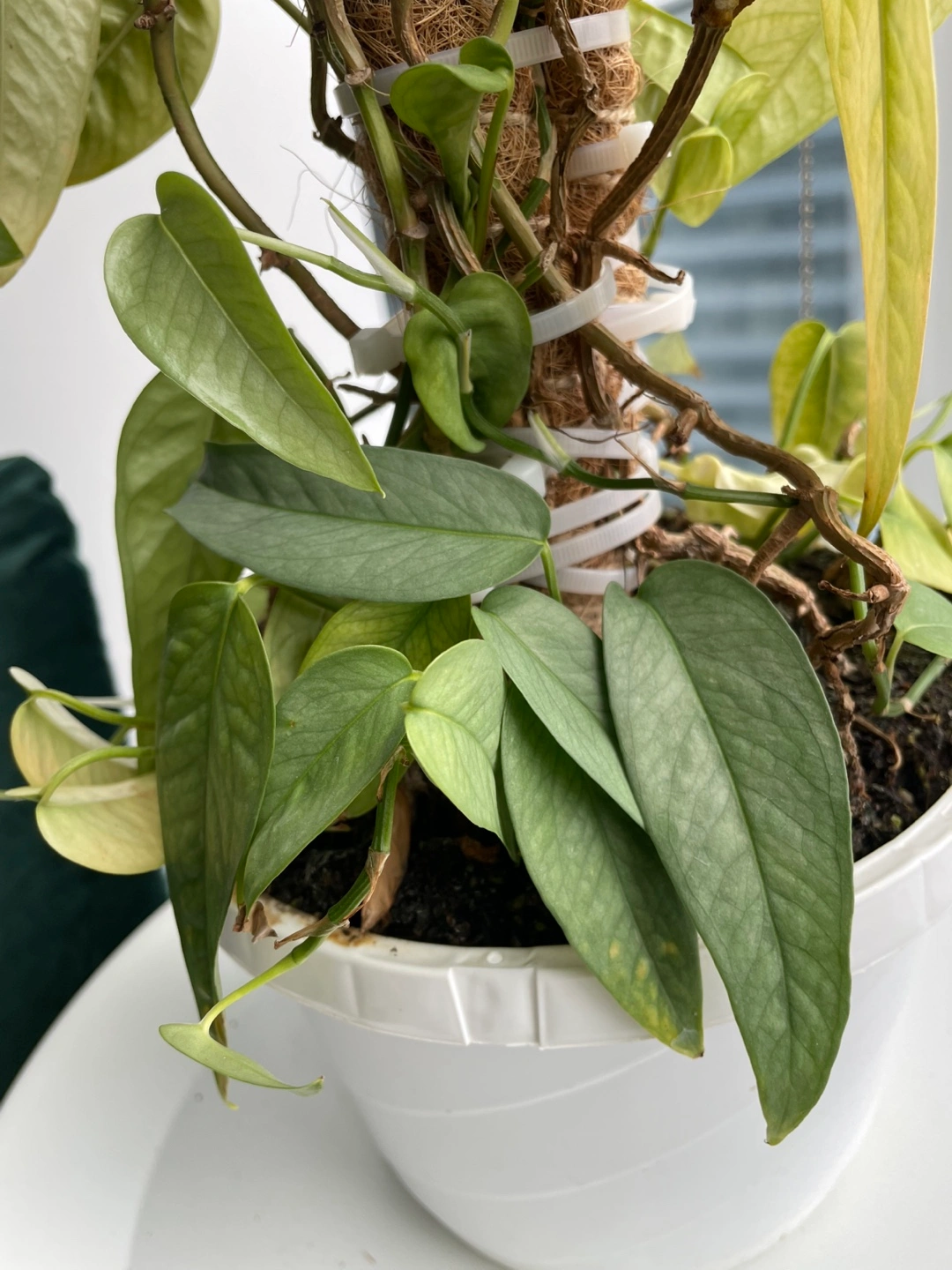 Cebu blue pothos plant, rarer than your regular pothos. Potted in a white plastic pot. Comes with a moss pole for it to climb on.