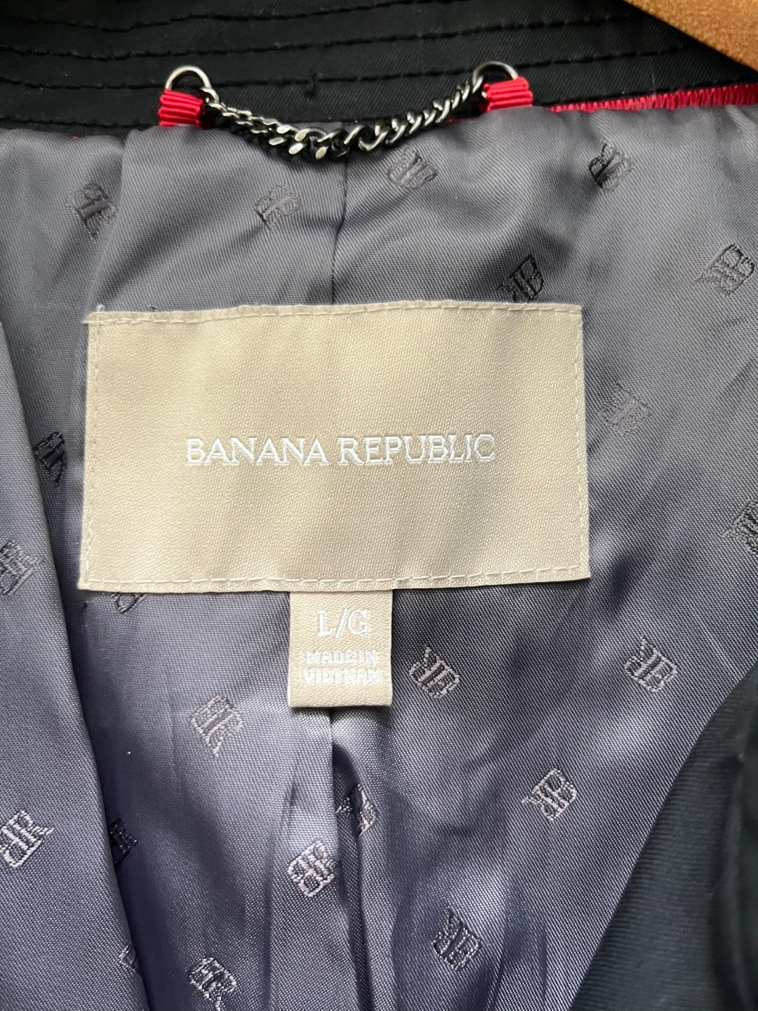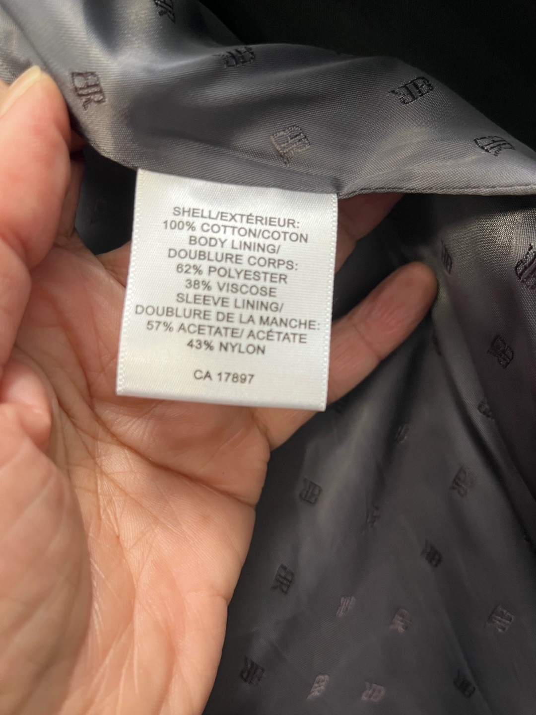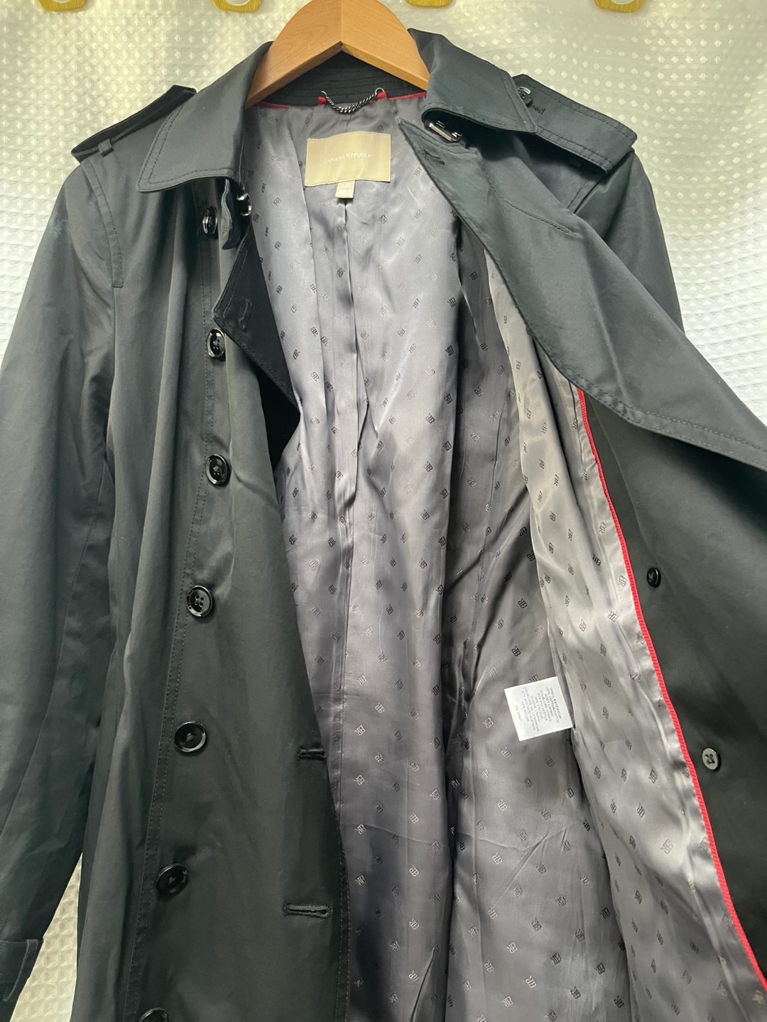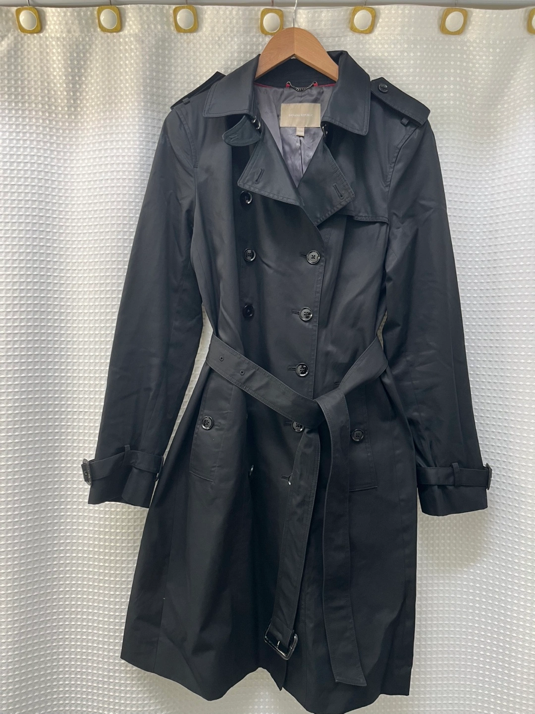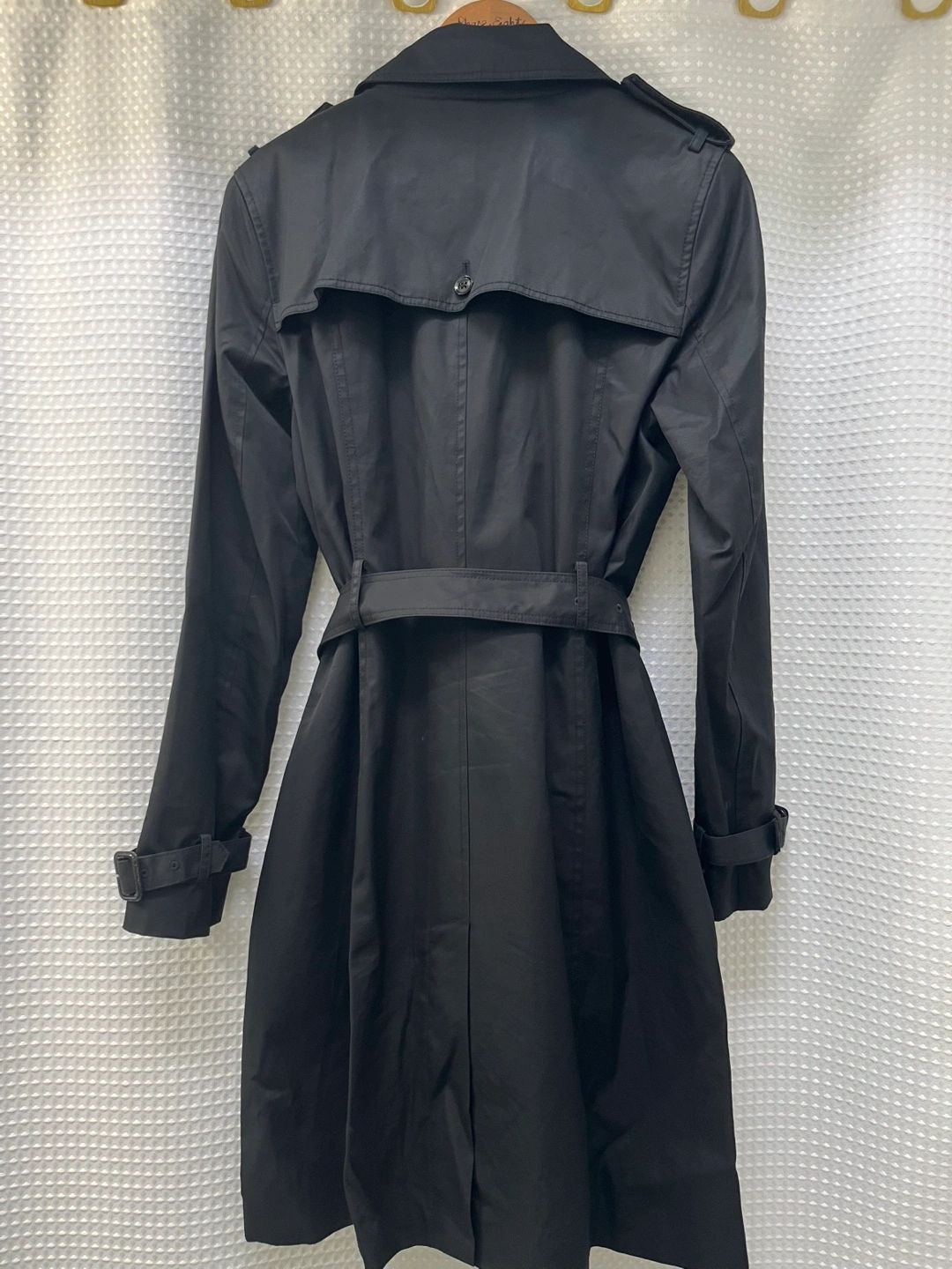 Classic black trench coat. Double-breasted, belted. Long sleeves, button closure. 100% cotton shell, polyester/viscose lining.