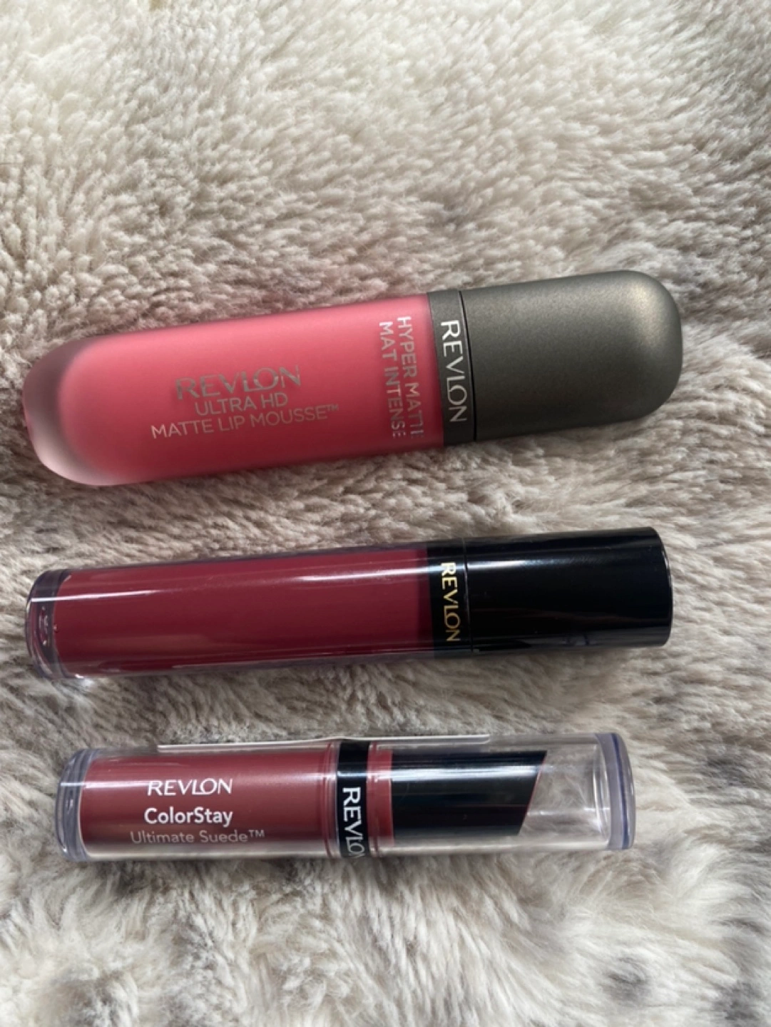 3 bundle Ultra HD Matte Lip Mousse, Super Lustrous Gloss in Black Cherry, and ColorStay Ultimate Suede