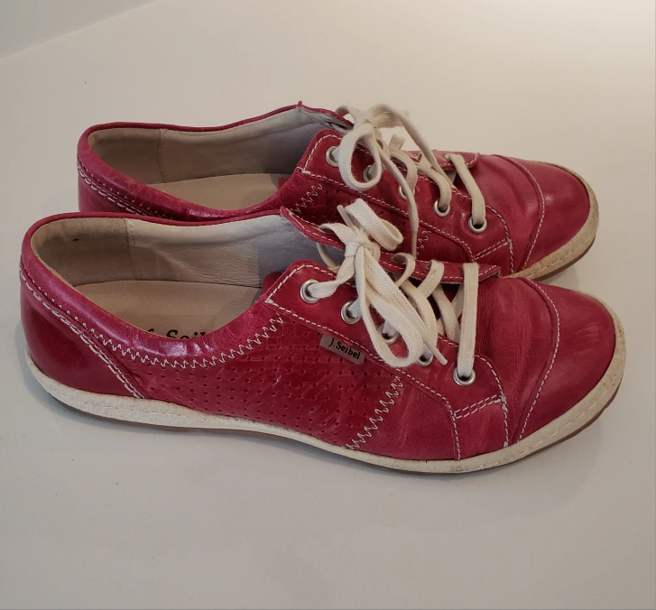 339Red leather sneakers. Lace-up. Perforated detailing. Cream-coloured trim and laces. Slightly worn. Selling as too narrow for me.