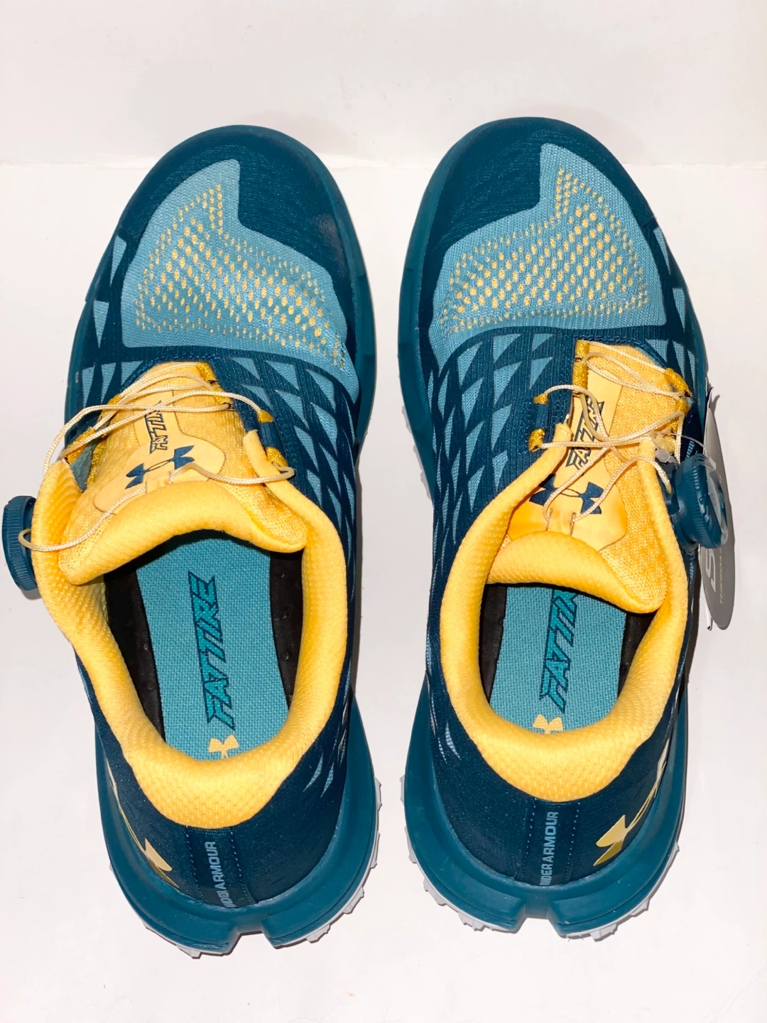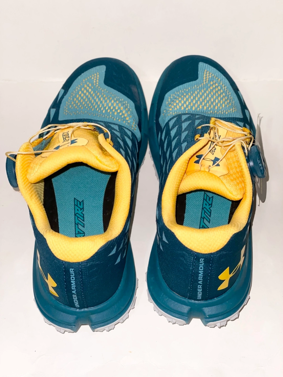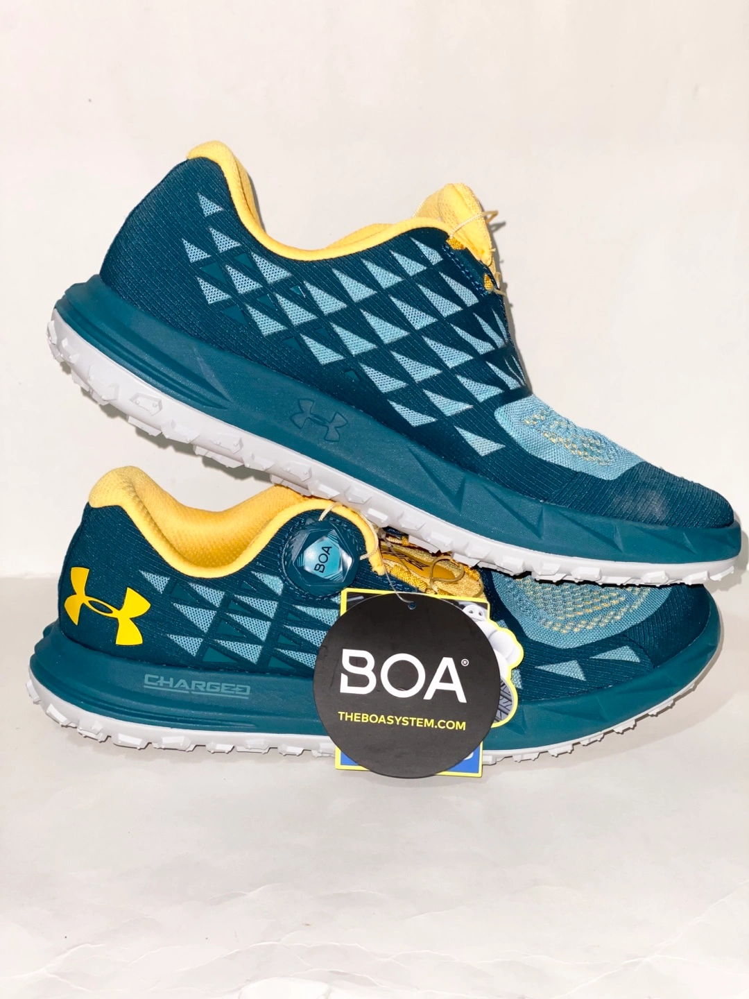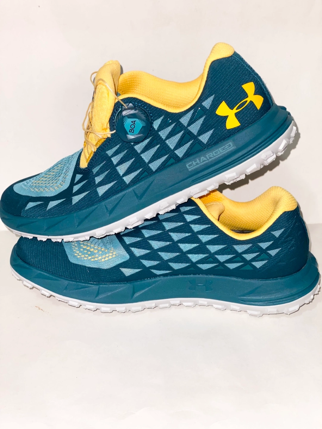 Women's trail running shoes. Size 9. Teal and yellow colour. BOA lacing system. Charged cushioning. New in open box.