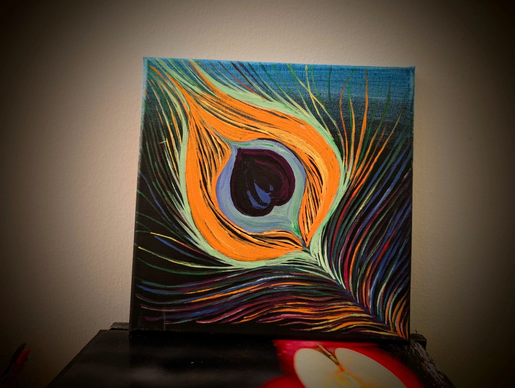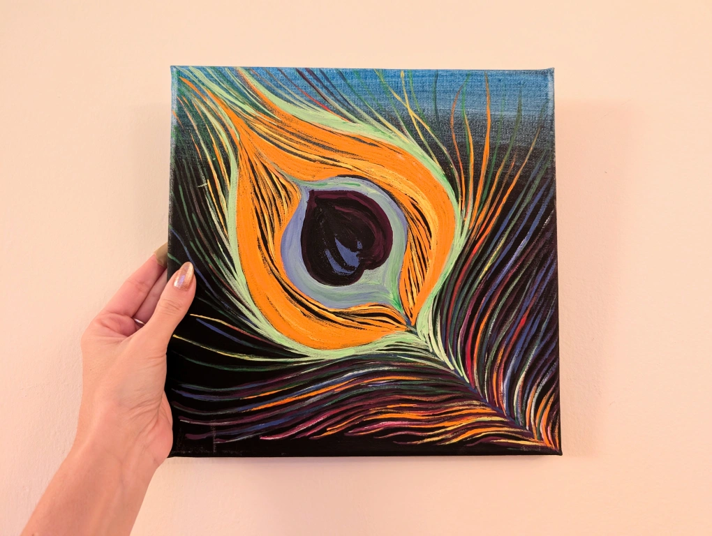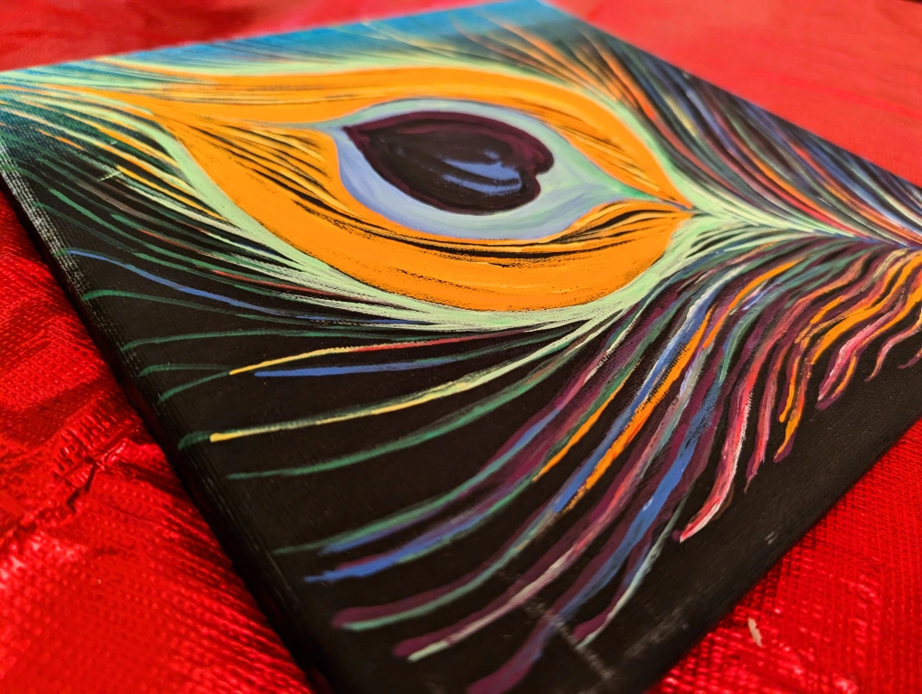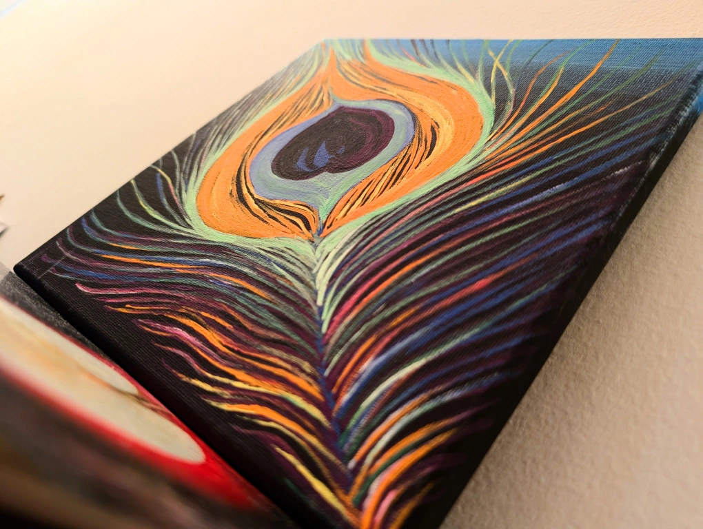 Hand-painted artwork featuring a vibrant peacock feather. Acrylic on canvas. Small size, perfect for a desk or shelf. Unique colours and texture.