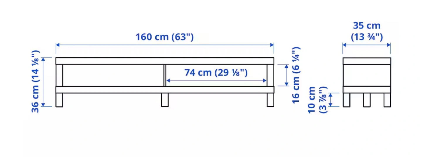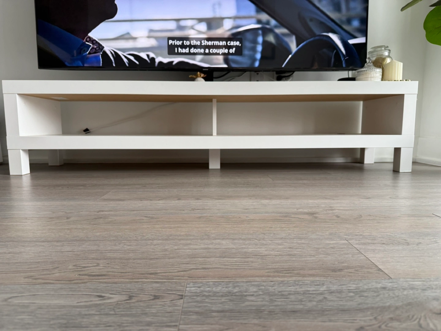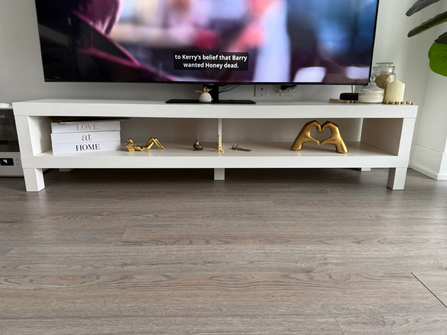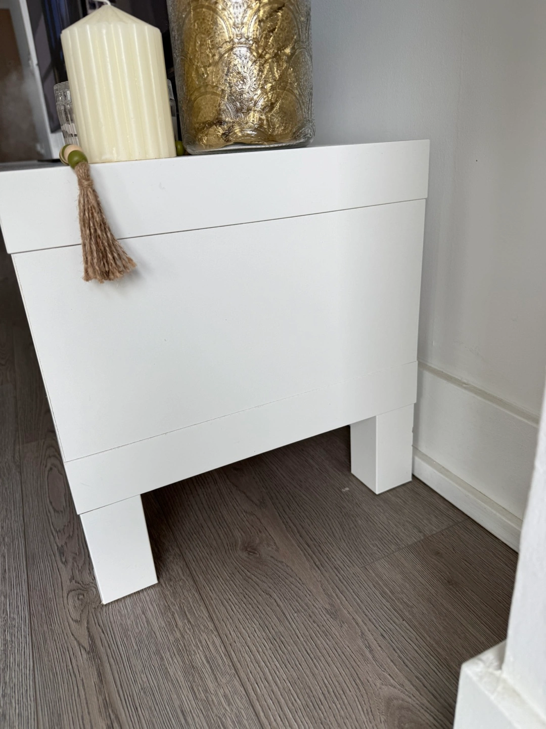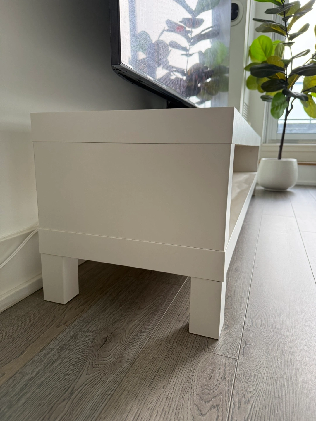 White TV unit. Two shelves. Good condition. Simple assembly. Measurements in image.