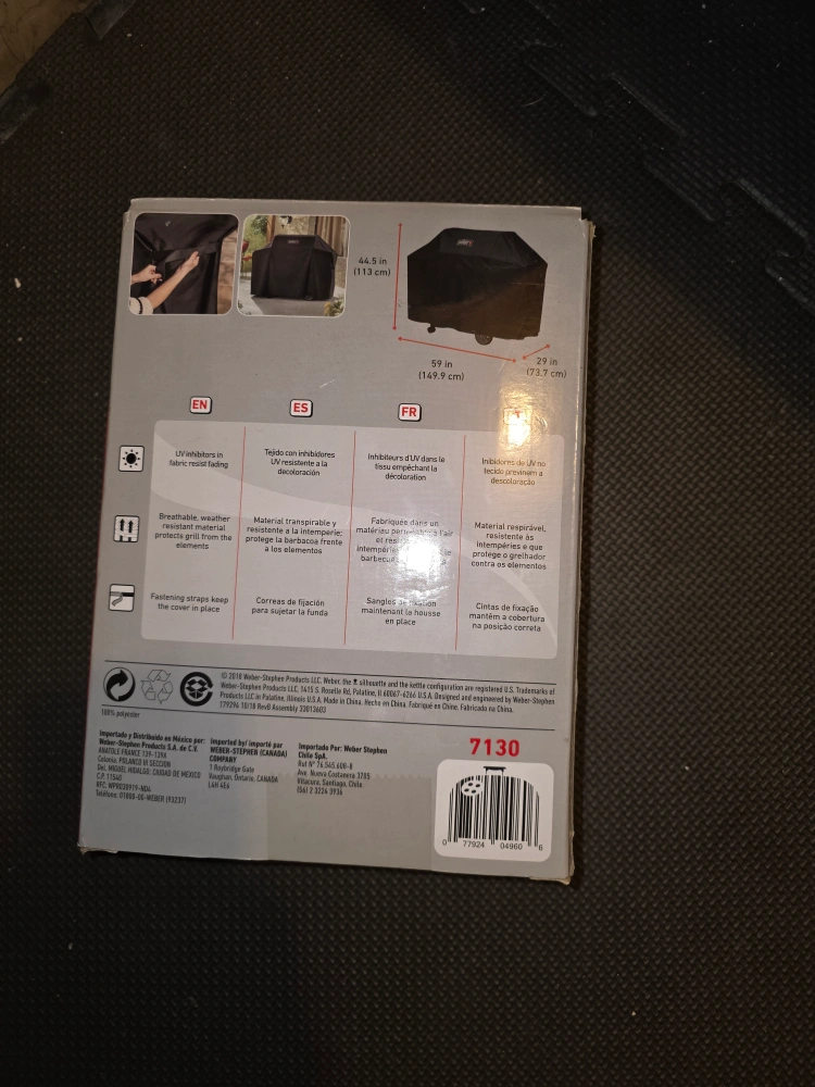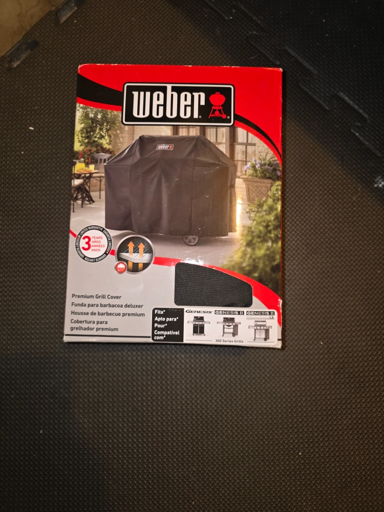 New in box. Premium barbecue cover. Fits Genesis II series grills. Features breathable, weather-resistant material. Fastening straps keep cover in place.