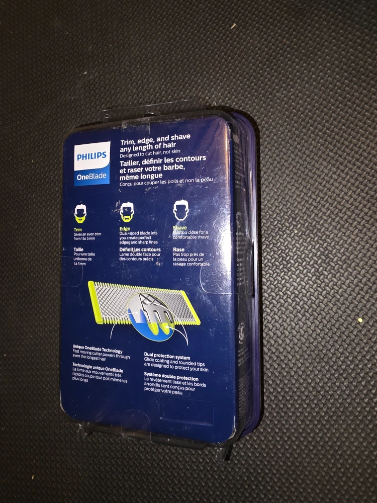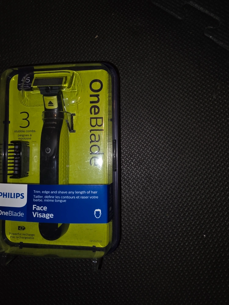 New, unopened Philips OneBlade face trimmer. Includes three stubble combs. Trim, edge and shave any length of hair. Powerful rechargeable.