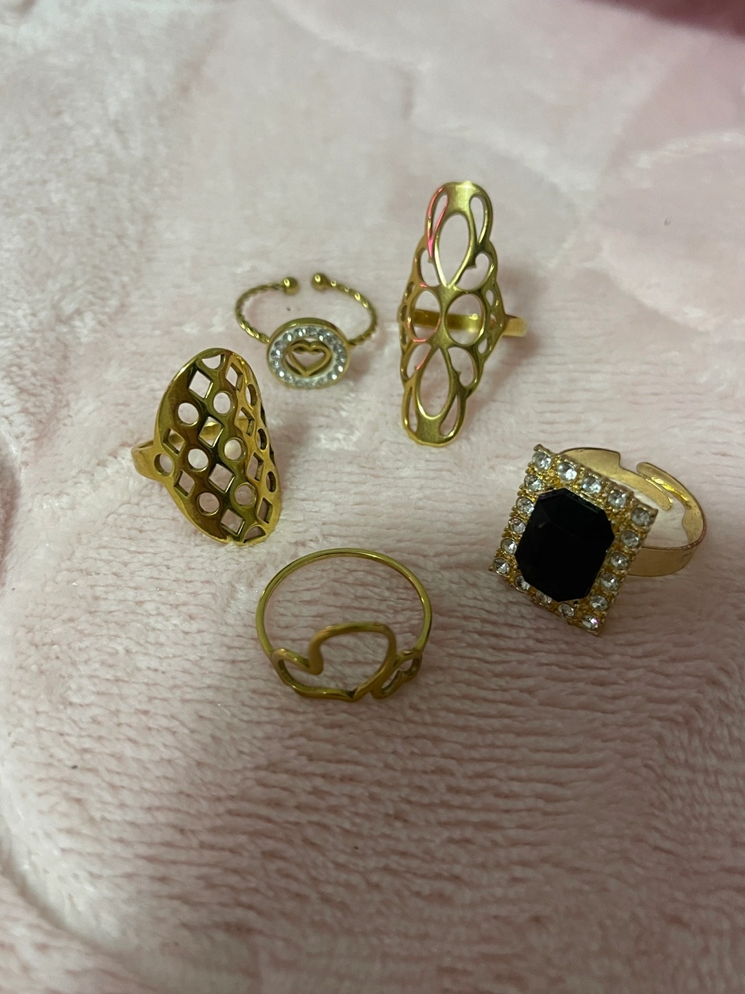 Five gold-coloured rings. Various styles and designs. Some rings feature cut-outs, others have crystals or gemstones. Perfect for layering or wearing individually. All stainless steel accept one with black gemstone all size 8 and 2 are adjustable