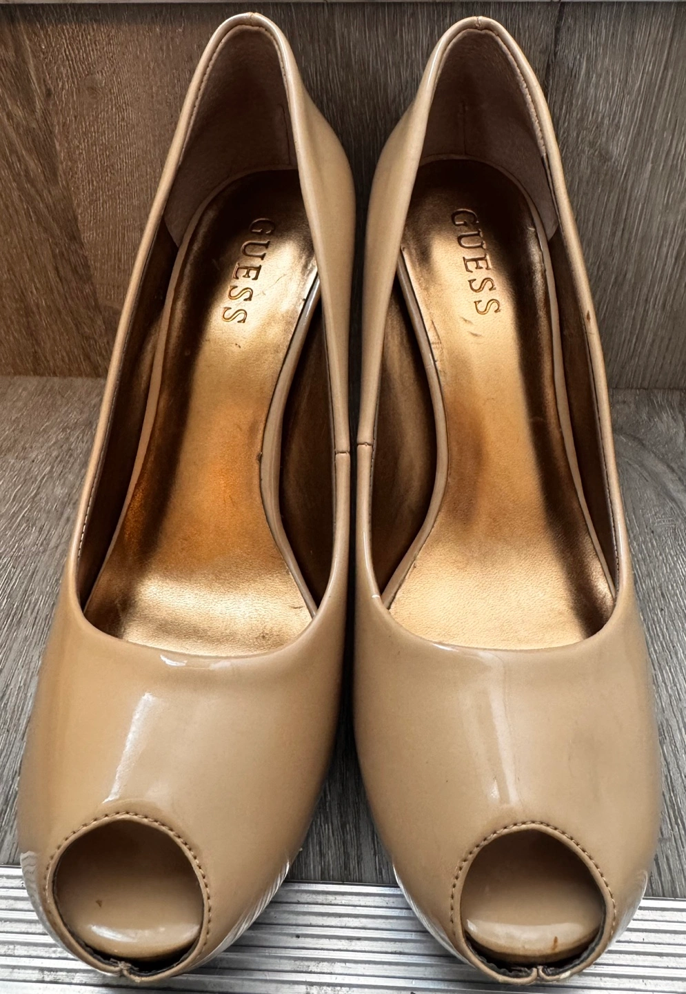 Beige patent leather peep-toe heels. High heels. Good for a night out.