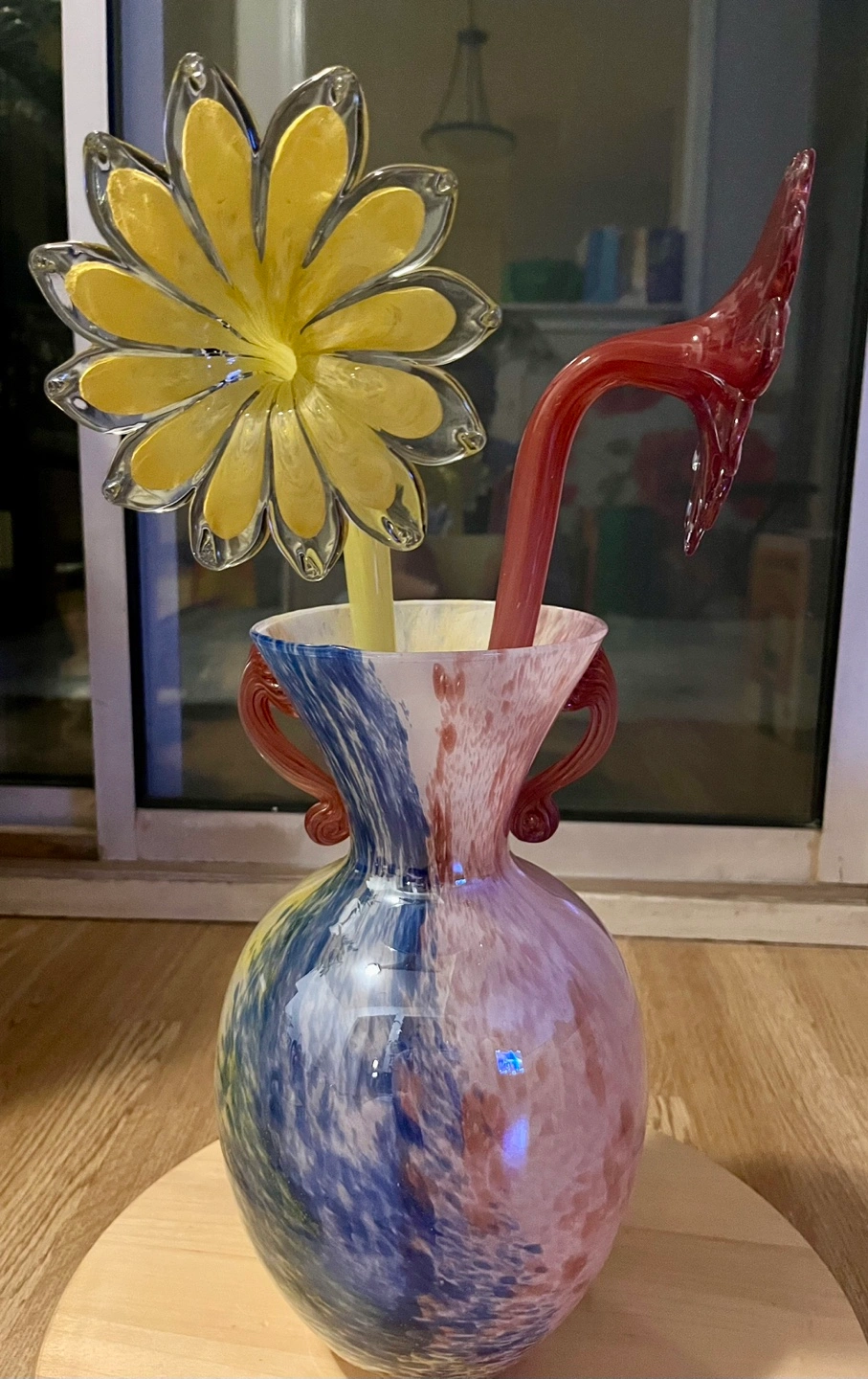 Handcrafted Murano glass vase. Features swirling colours and unique handles. Includes a yellow and a red glass flower arrangement.