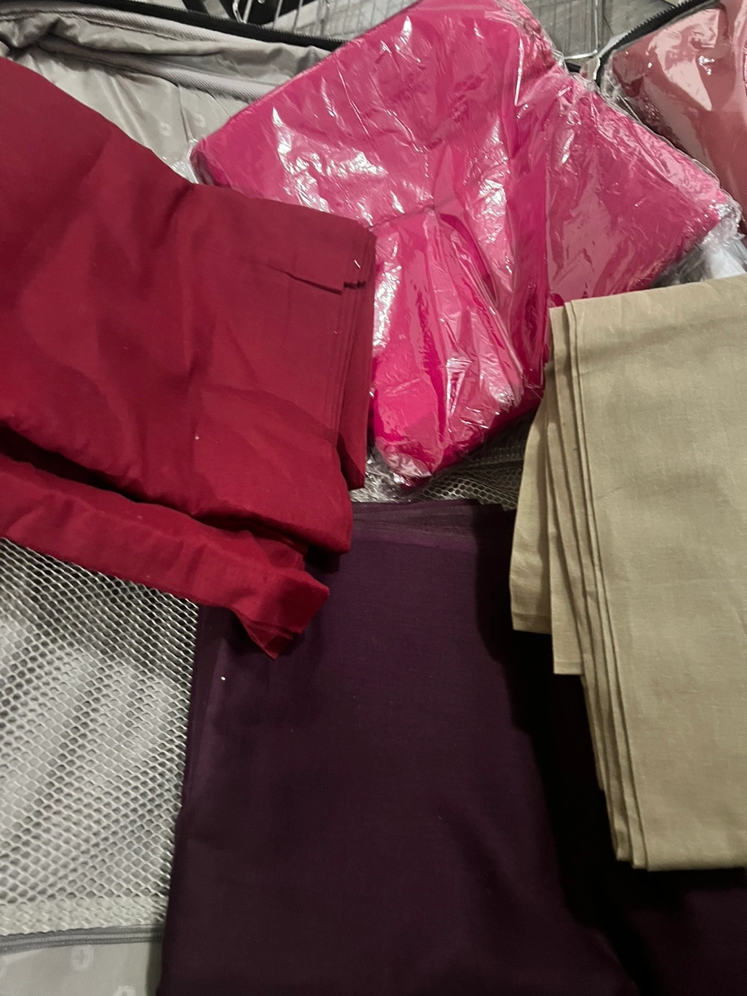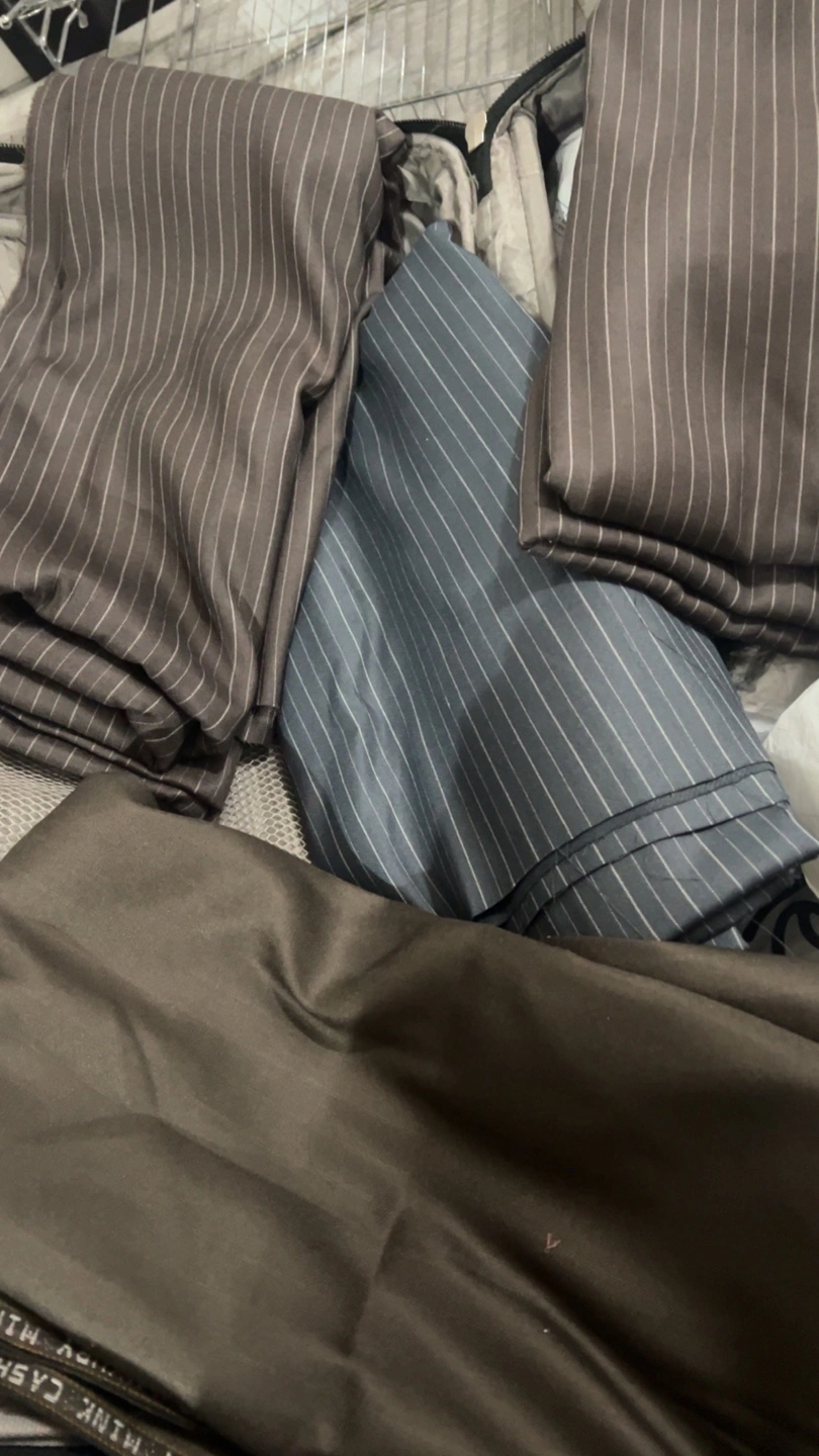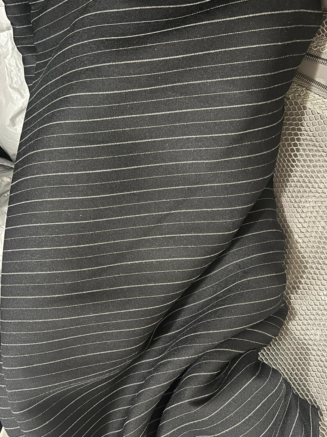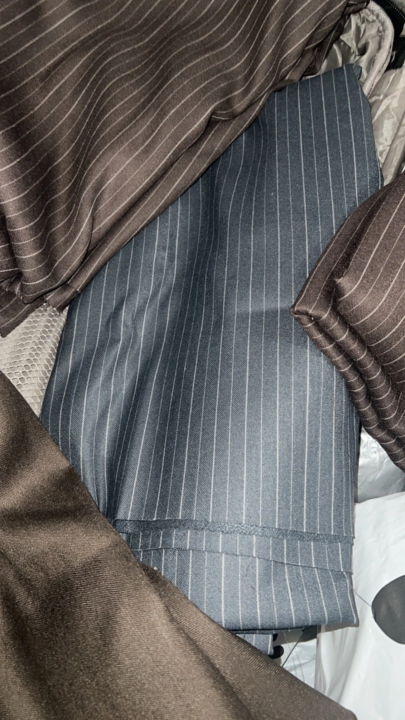 10Bundle of pinstripe and solid coloured suit fabrics. Colours include brown, dark grey, burgundy, and black. Great for tailoring projects.