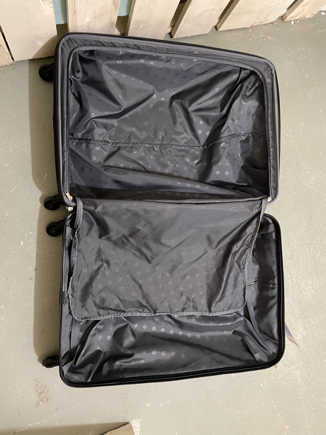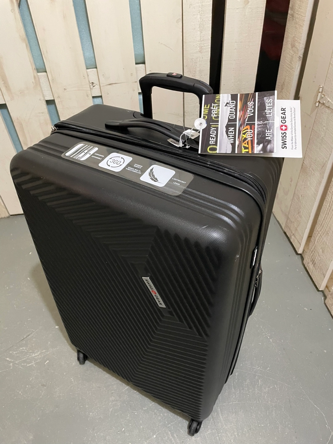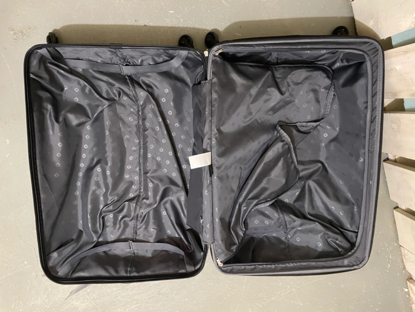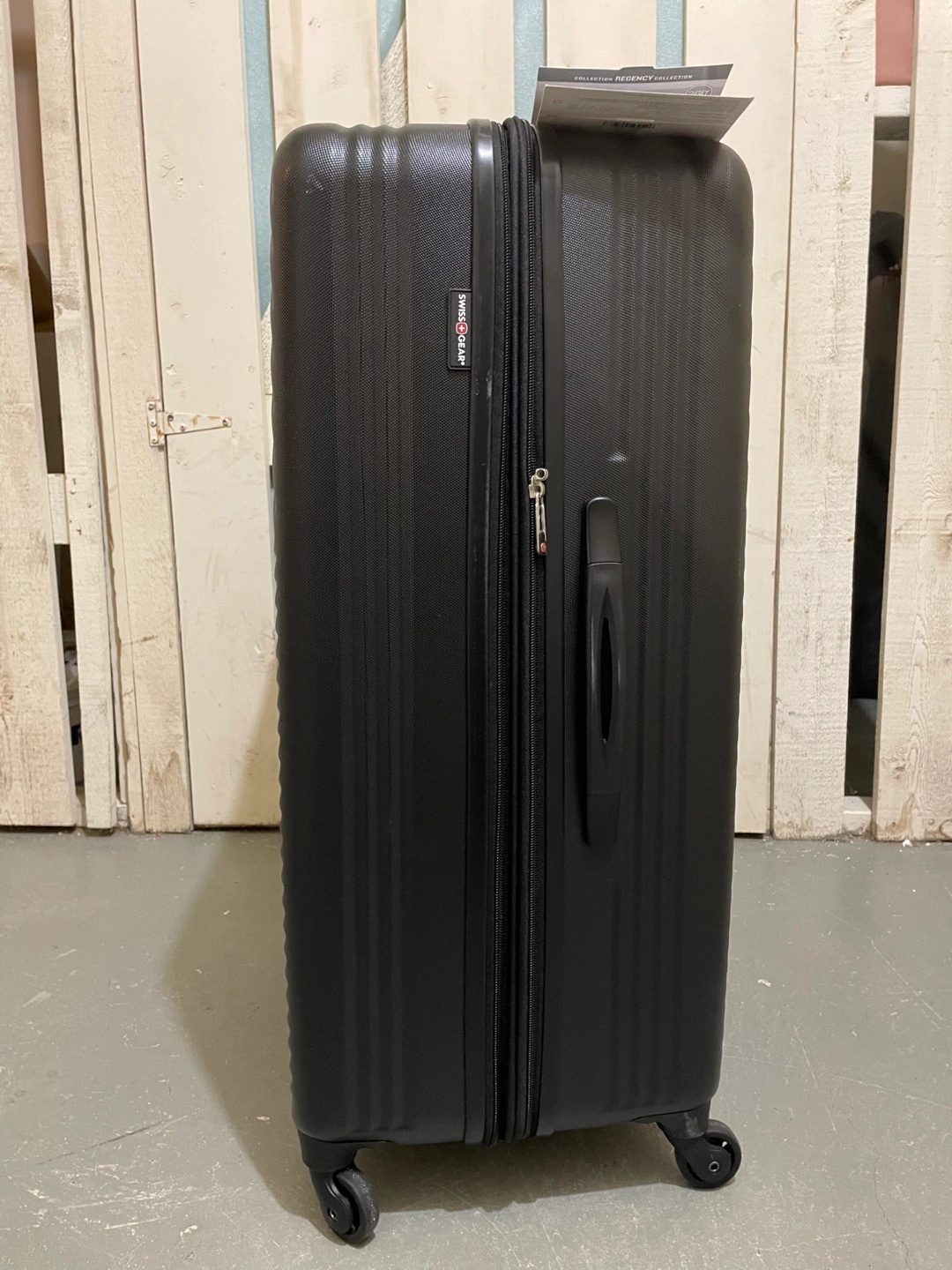 Brand New large checked suitcase. Black hard shell exterior. 360 Spinner wheels. Multiple compartments inside. Regency collection.