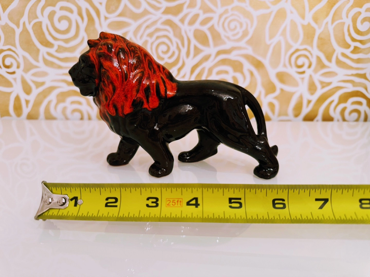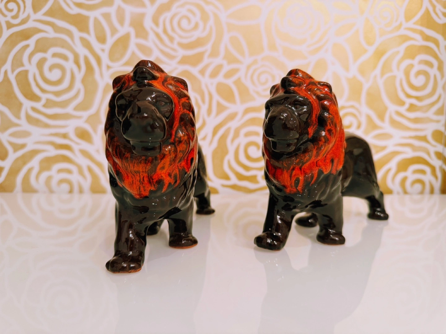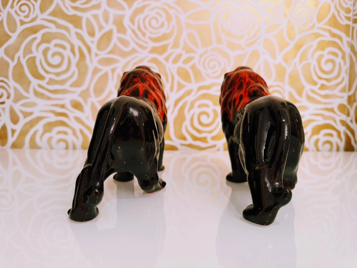56Evangeline Lion Figurine Canuck Pottery Drip Glaze - Hard to find such good drip work for lion’s hair Vintage Retro Mid Century Excellent Condition $45 for the pair Please see pictures for details and dimensions.