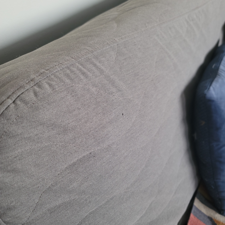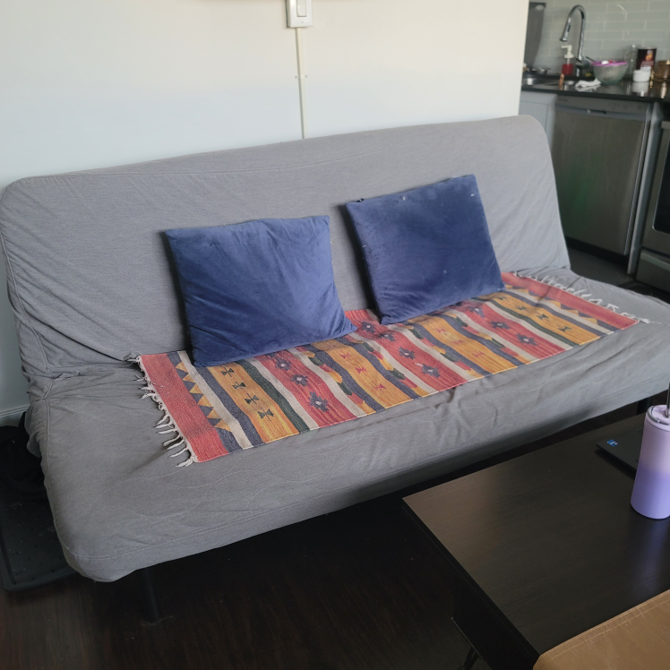 Comfortable grey futon, includes two dark blue cushions. Suitable for small spaces. Shows some minor wear. Extra sofa cover is included to change in color beige, only used once. Please contact as soon as possible, I'm want to give it away soon before moving out in few days. Original proce- $649. Price is as low as it can go.