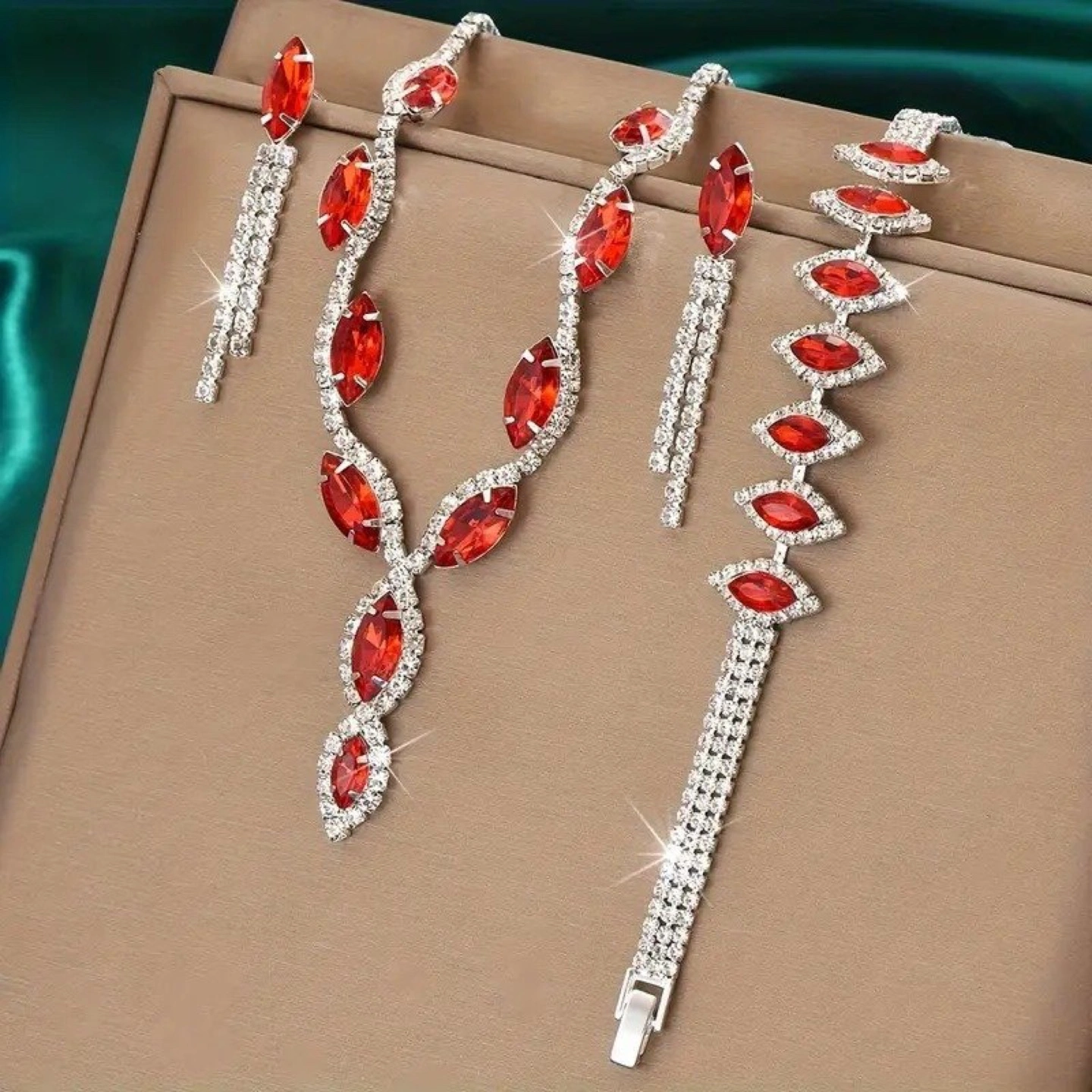 55Stunning red crystal jewellery set. Includes necklace, dangling earrings, and bracelet. Silver-toned metal. Elegant and eye-catching.