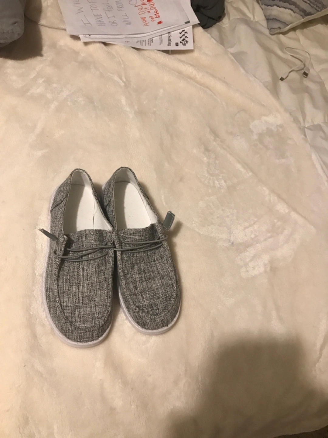 Pair of grey slip-on casual shoes. Size 8. Fabric upper, white sole. Only worn to try on , bought online and they are to big for me. I have other free things