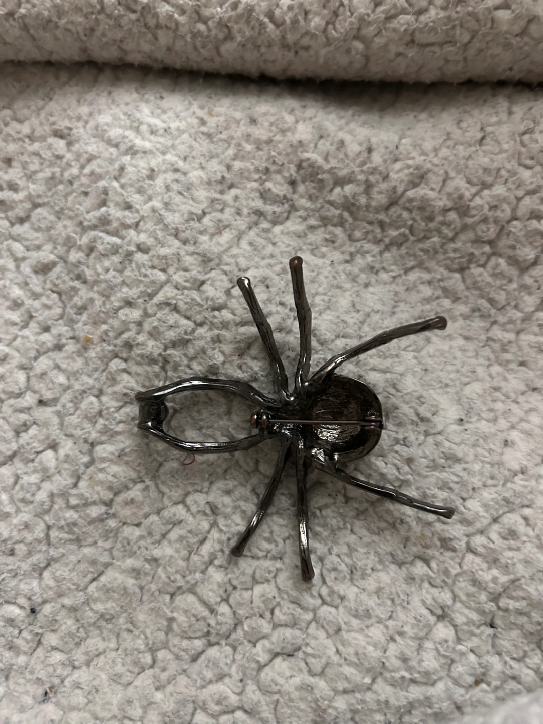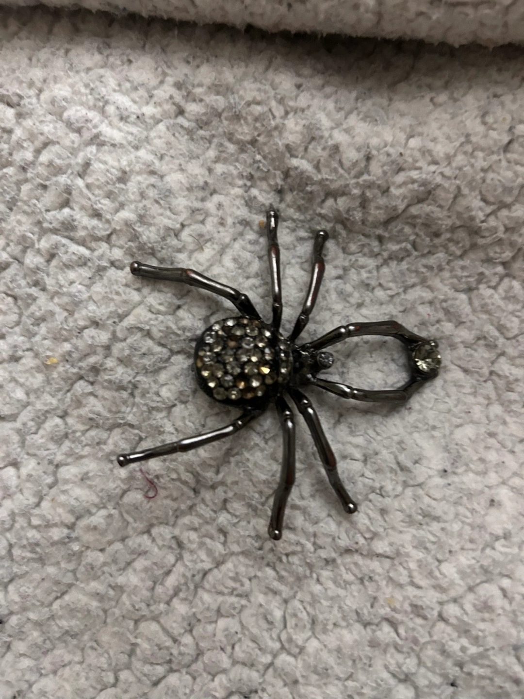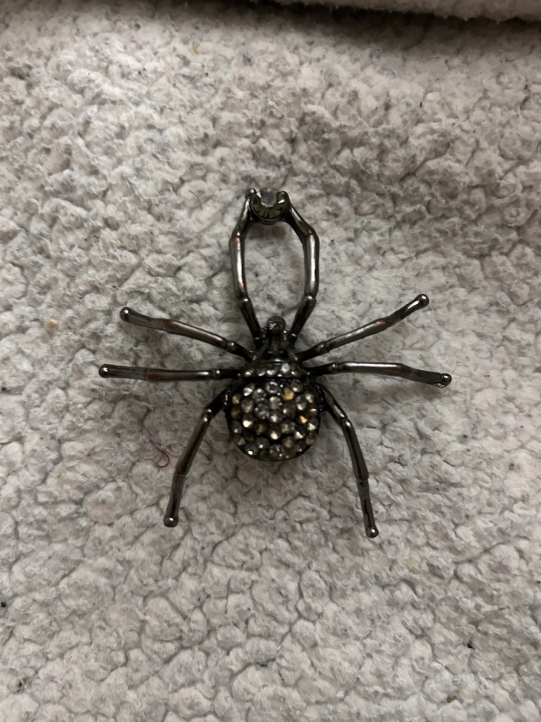 Gunmetal brooch shaped like a spider. Body covered in clear and grey rhinestones. Perfect Halloween accessory.