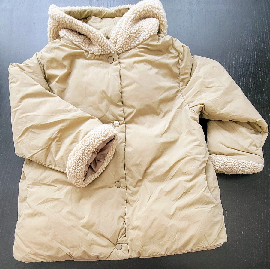Adorable kids' puffer jacket. Beige colour. Features a sherpa lined hood and cuffs. Snap button closure. Perfect for colder weather.