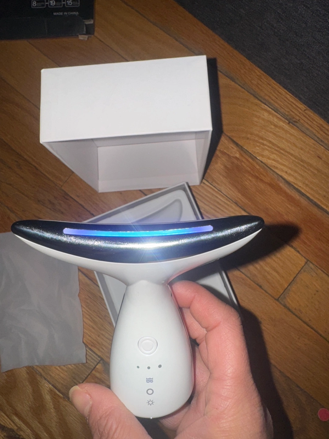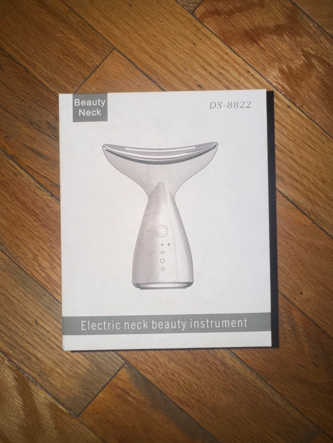 Electric neck beauty instrument. White and silver colour. Includes box and instructions. Light therapy device.