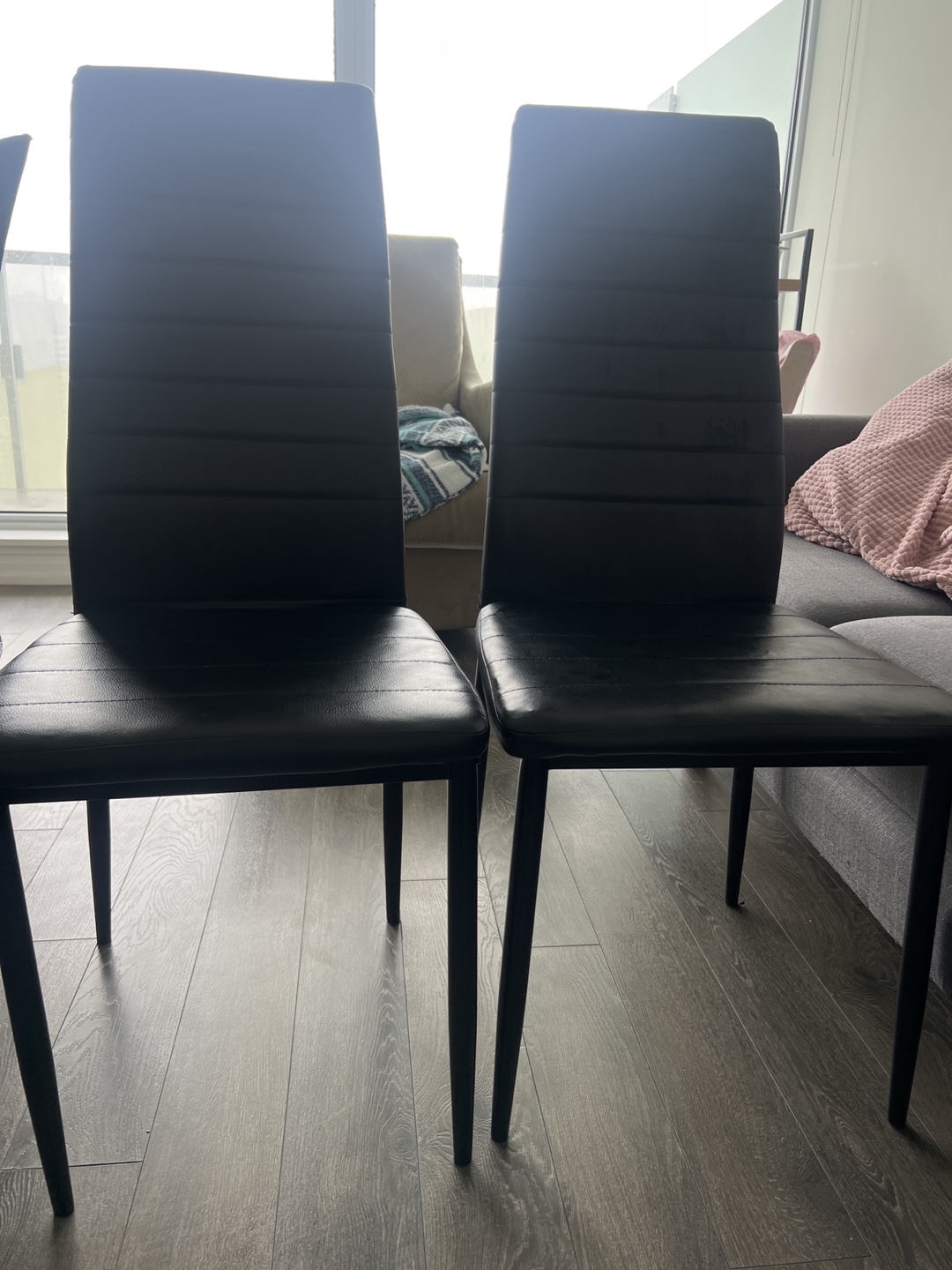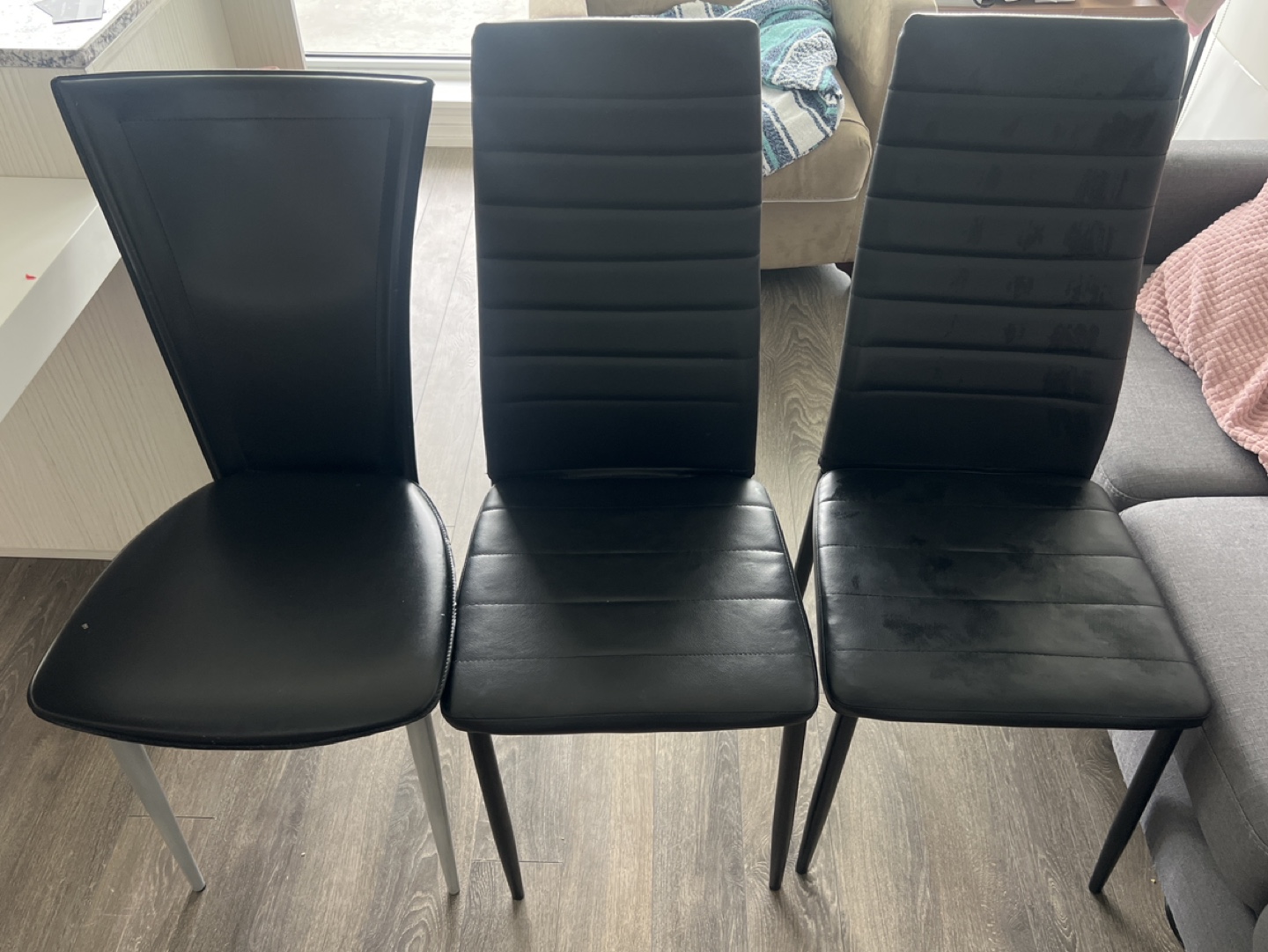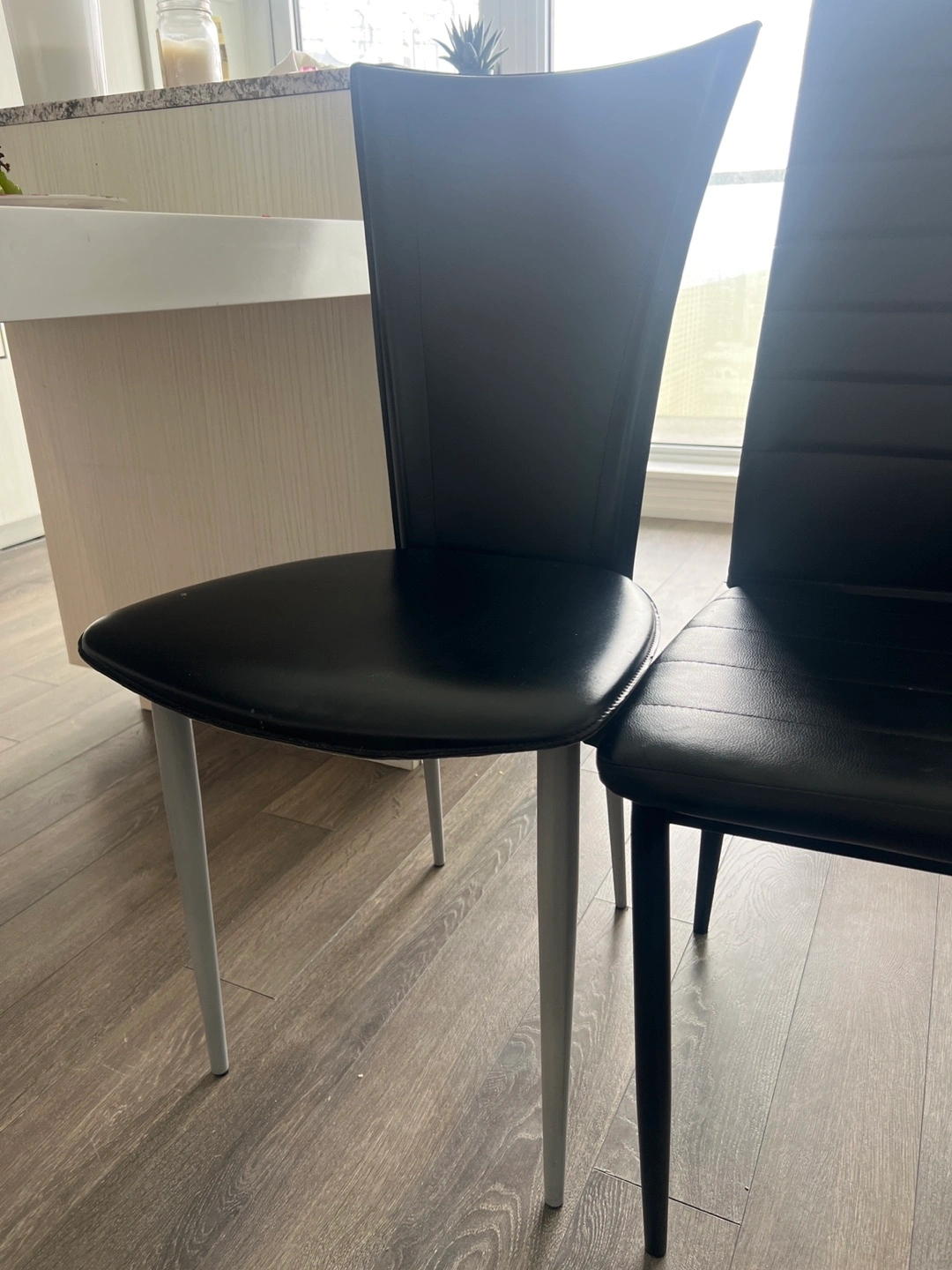 3 modern dining chairs. Black faux leather seats and backs. One chair has silver legs, two have black legs. Minimal wear.
