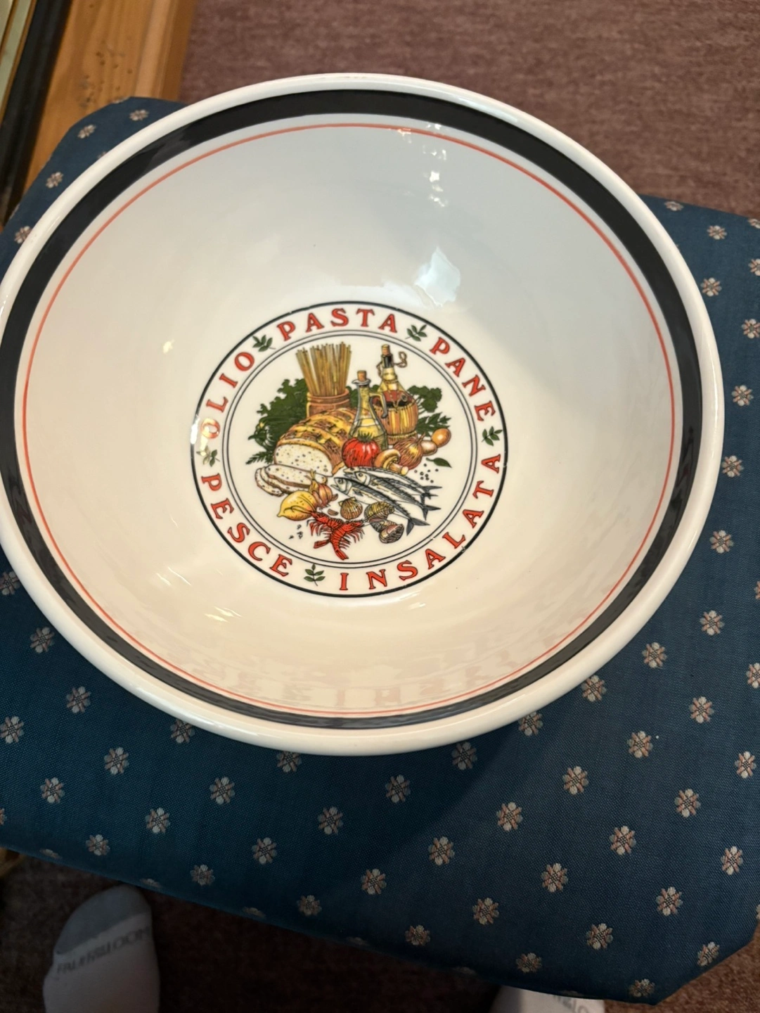 67Large porcelain bowl. Features an Italian-themed design with food illustrations and text. Black and red accents. Suitable for pasta or salad serving.