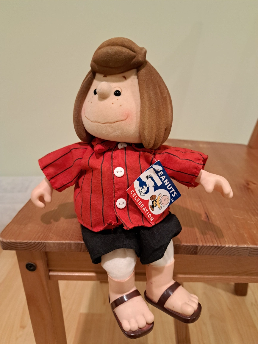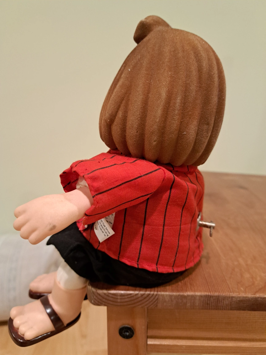 Collectible Sally Brown wind-up doll. Red and black striped shirt. Brown hair. Black shorts. Brown sandals. Peanuts Celebration tag.