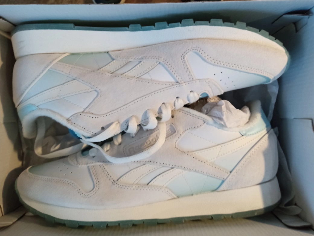 New Reebok Classic Leather running shoes. Unisex style. Size 10.5 US. White and light blue colourway. Come in original box.