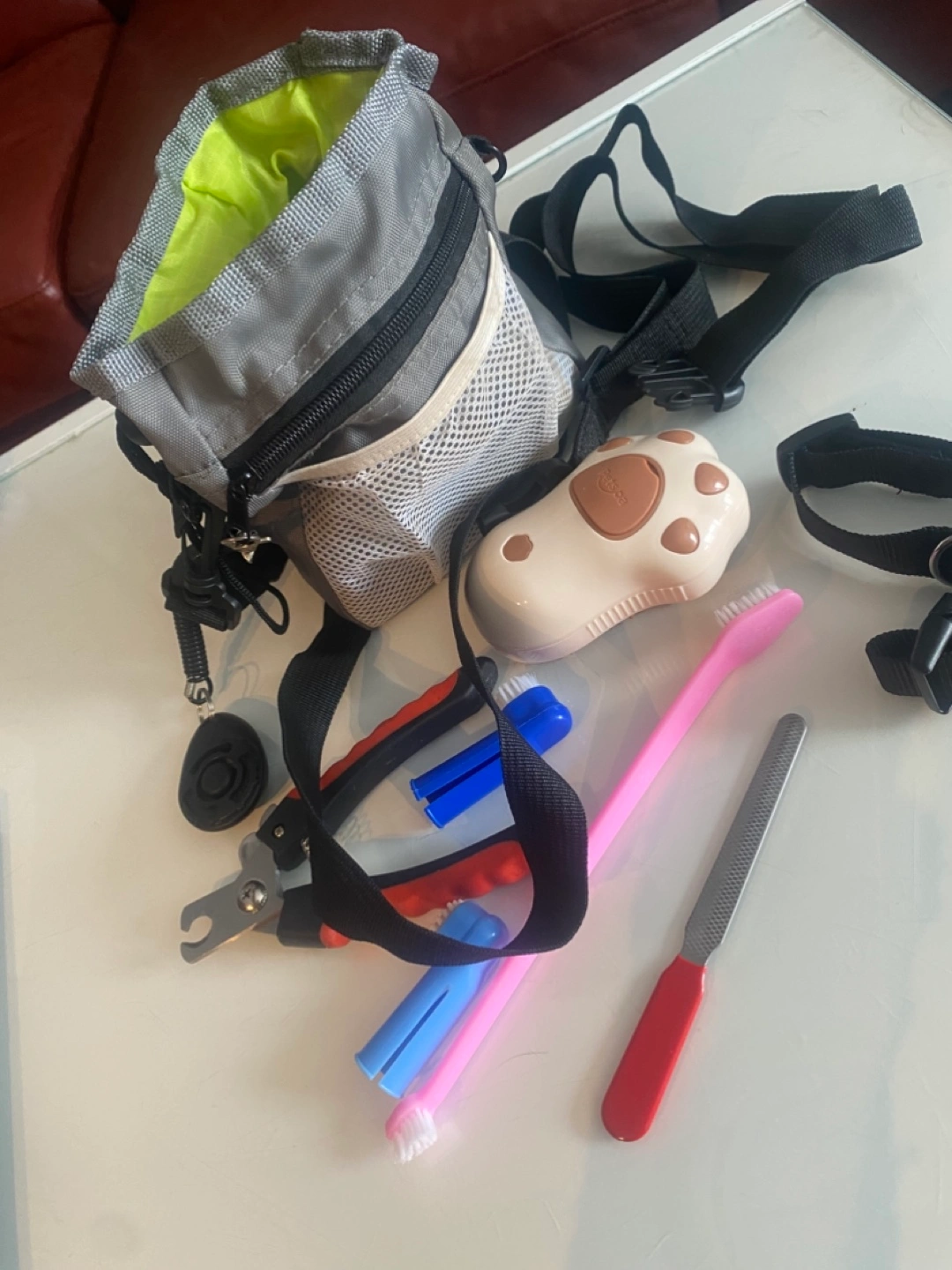 Grey travel bag with adjustable strap. Includes nail clippers, brushes, poop bag, and nail file. Great for walks!