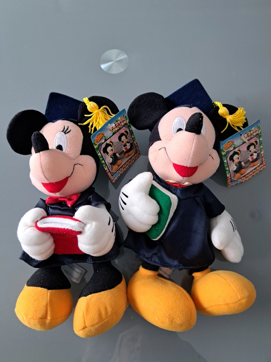 10" Two adorable Micky and Minnie Mouse plush toys. Graduation gowns and caps. Holding certificate with tags. $15 each or $25 pair