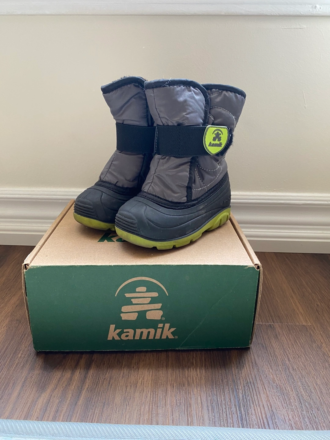 621Grey and black Kamik Snowbug 3 winter boots. Size 6. Features a velcro closure and a lime green outsole. Comes in original box. Pick up only, Wilson Heights and Sheppard area Bundle offers welcome Cash only, no etransfer